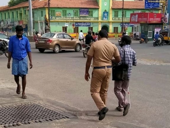 நேற்று பணியின்போது பார்வையற்ற ஒருவர் வெகு நேரம் சாலையை கடக்க சிரமப்பட்டதை பார்த்த காவலர் உதயராஜன் மனித நேயத்துடன் சாலையை கடக்க உதவினார்.