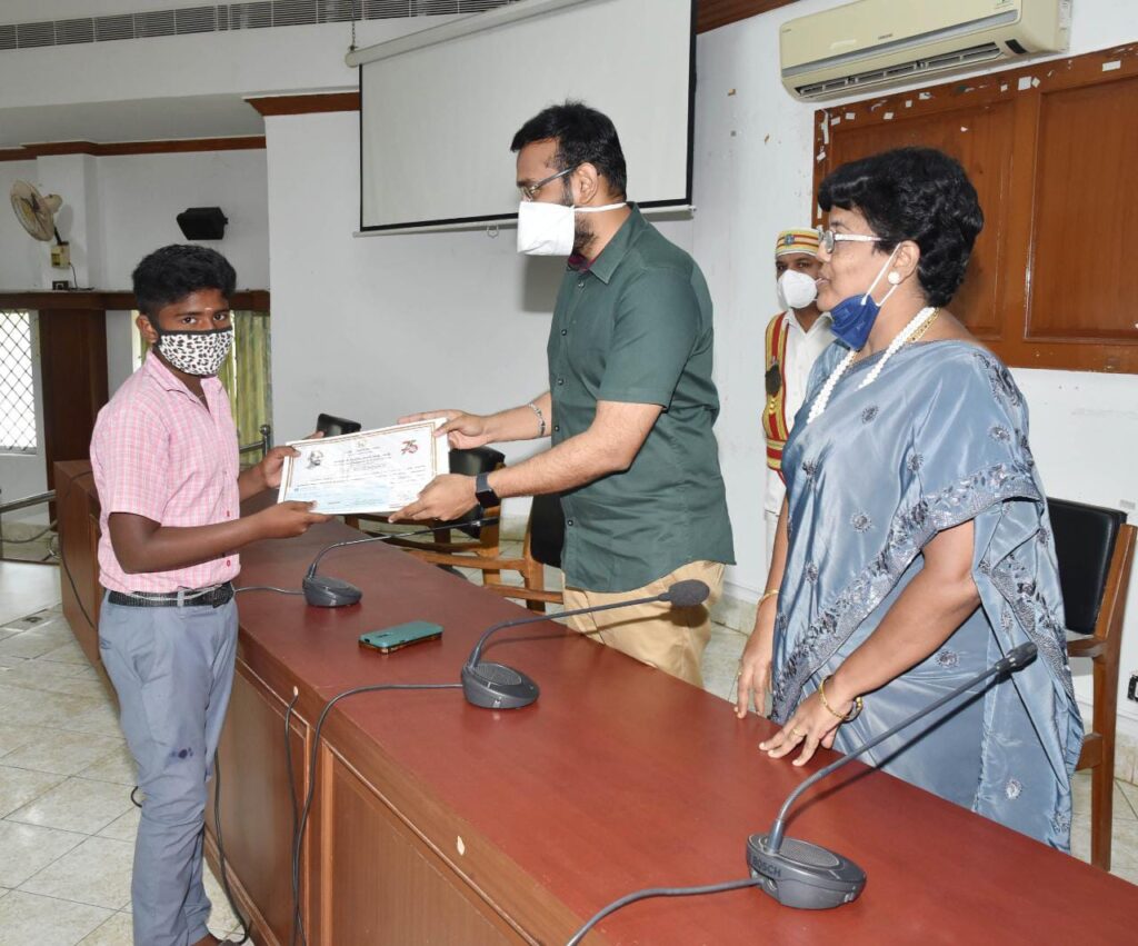 அப்போட்டிகளில் வெற்றி பெற்ற மாணவர்களுக்கு முதல் பரிசாக ரூ.5000 இரண்டாம் பரிசாக ரூ.3000 மூன்றாம்; பரிசாகரூ.2000 மற்றும் அரசுப் பள்ளி மாணவர்களில் சிறப்பு பரிசாக இரண்டு பேருக்குத் தலா ரூ.2000க்கான காசோலையும், பாராட்டுச் சான்றிதழ்களும் வழங்கினார். மேலும், மாவட்டத்தில் 2019ஆம் ஆண்டில் தமிழில் சிறந்த குறிப்புகள் வரைவுகள் எழுதியஅரசுப் பணியாளர்களுக்குப் பாராட்டுச் சான்றிதழும் ஆட்சிமொழித் திட்டச் செயலாக்கத்தில் சிறந்து விளங்கிய மாவட்ட நிலை அலுவலகமான இந்து சமய அறநிலையத் துறை உதவி ஆணையர் அலுவலகத்திற்குப் பாராட்டுச் சான்றிதழும் வழங்கினார்.