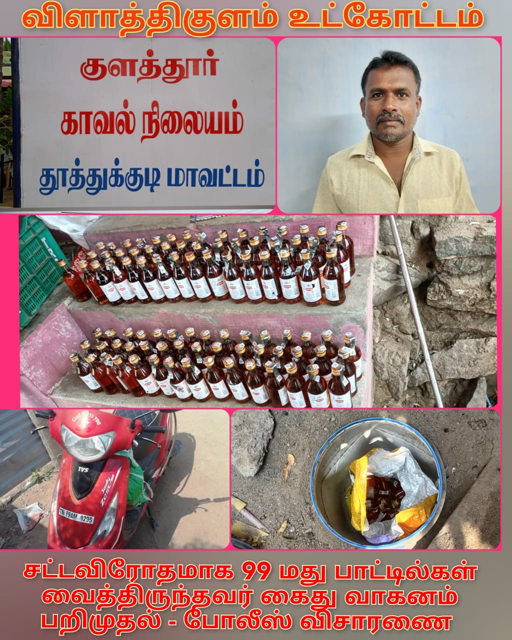 உடனடியாக மேற்படி போலீசார் அவரை கைது செய்து, அவரிடமிருந்து 99 மதுபாட்டில்கள் மற்றும் TN69 AM 8295 (TVS Scooty Zest) என்ற எண் கொண்ட இருச்சக்கர வாகனத்தையும் பறிமுதல் செய்தனர்.*