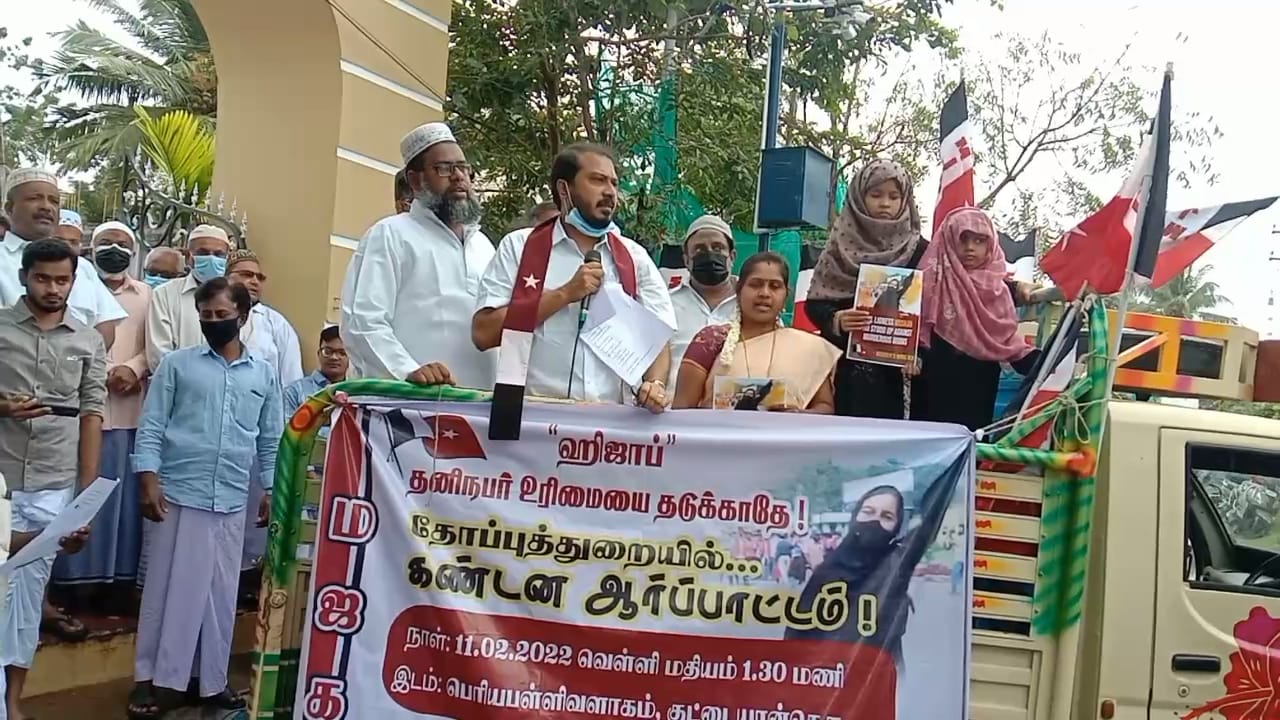 கர்நாடகாவில் இஸ்லாமியப் பெண்கள் ஹிஜாப் அணிந்து கல்வி நிலையங்களுக்குச் செல்ல சங்பரிவார் அமைப்பினர் எதிர்ப்பு தெரிவித்து வரும் நிலையில , நாகை மாவட்டம் வேதாரண்யம் அடுத்த தோப்புத்துறை பெரிய பள்ளிவாசல் அருகே சங்பரிவார் அமைப்பினருக்கு எதிர்ப்பு தெரிவித்து மனிதநேய ஜனநாயக கட்சியின் சார்பில் கண்டன ஆர்ப்பாட்டம் நடைபெற்றது.