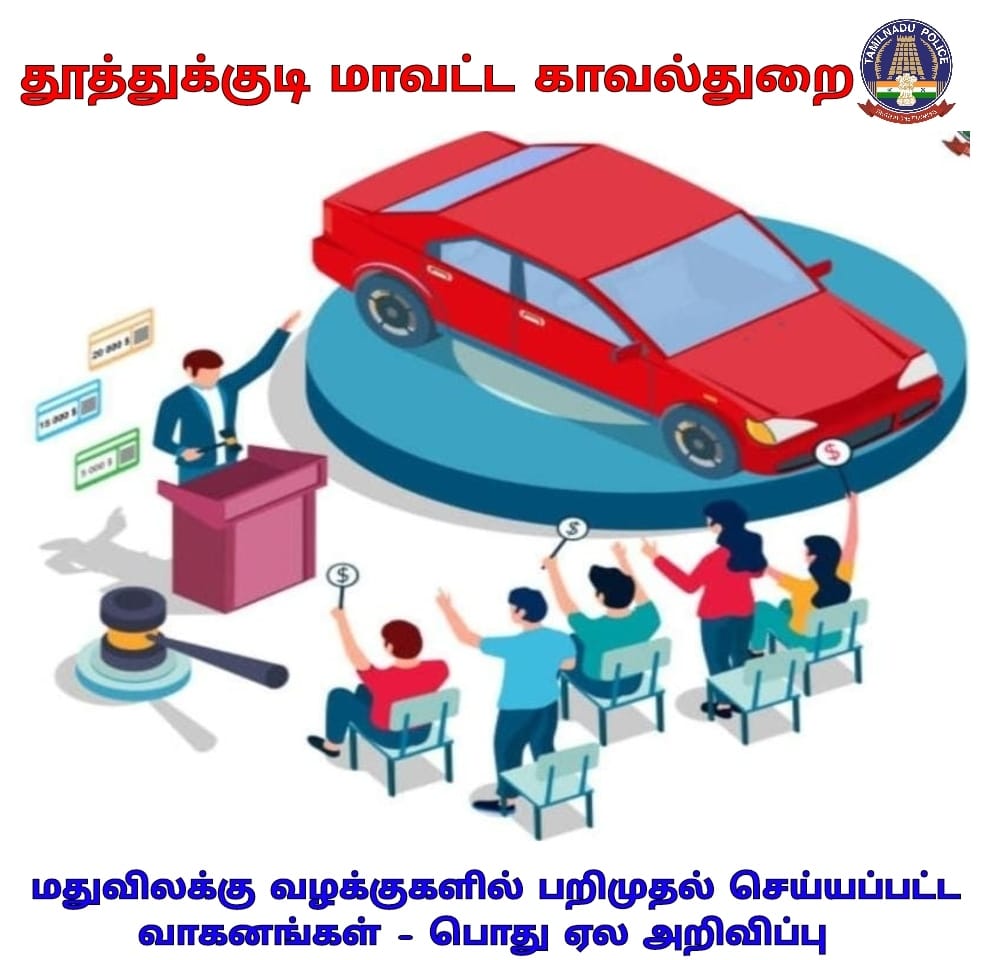 தூத்துக்குடி மாவட்டத்தில் மதுவிலக்கு தொடர்பான குற்ற செயல்களில் பதிவு செய்யப்பட்ட வழக்குகளில் தொடர்புடைய நபர்களிடமிருந்து பறிமுதல் செய்யப்பட்ட இருசக்கர வாகனங்கள் – 22, நான்கு சக்கர வாகனங்கள் – 3 என மொத்தம் 25 வாகனங்கள் தமிழ்நாடு மதுவிலக்கு சட்டம் 1937 கைப்பற்றப்பட்ட பொருள்கள் முடிவு செய்தல் தொடர்பான திருத்தப்பட்ட சட்டம் விதிகள் 1979ன்படி பொது ஏலத்தில் விட்டு அரசுடைமையாக்குவதற்கு தீர்மானிக்கப்பட்டுள்ளது.*