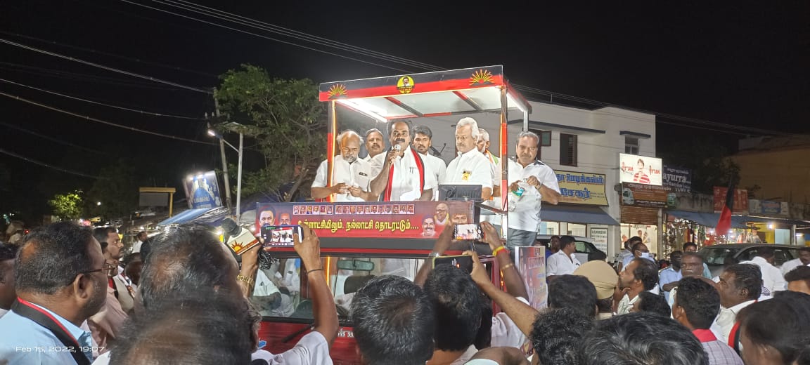எதிர்வரும் 19ஆம் தேதி தமிழகம் முழுவதும் நகர்ப்புற உள்ளாட்சி தேர்தல் நடைபெற உள்ளது. நாகை மாவட்டம் வேதாரண்யம் நகராட்சியில் 21 வார்டுகளுக்கான தேர்தல் நடைபெற உள்ளது. 21 வார்டுகளிலும் மதசார்பற்ற முற்போக்கு கூட்டணியில் இடம்பெற்றுள்ள திராவிட முன்னேற்றக் கழகம் , இந்திய தேசிய காங்கிரஸ் , மனிதநேய ஜனநாயக கட்சி வேட்பாளர்களை ஆதரித்து தமிழக சுற்றுச்சூழல்காலநிலை மாற்றத் துறை மற்றும் இளைஞர் நலன் விளையாட்டு மேம்பாட்டுத்துறை அமைச்சர் சிவ.வீ மெய்யநாதன் வாக்கு சேகரித்தார். தமிழக அரசு செயல்படுத்தி வரும் திட்டங்களையும், செயல்படுத்த உள்ள திட்டங்களையும் பட்டியலிட்டு பேசிய அமைச்சர் குடும்பத் தலைவிகளுக்கு உரிமை தொகை 1,000 ரூபாய் விரைவில் வழங்கப்படும் என பேசினார். வேதாரண்யம் நகராட்சிக்குட்பட்ட தோப்புத்துறை பெருமாள்கோயில், ஆறுகாட்டுத்துறை, வேதாரண்யம் மேலவீதி, மணியன் தீவு, அகஸ்தியன் பள்ளி மன்மதன் கோயில், மற்றும் மறைஞாயநல்லூர் பகுதிகளில் திறந்த வேனில் நின்றபடி வாக்காளர்களிடம் அந்தந்த வார்டுகளில் வேட்பாளராக போட்டியிடும் மதசார்பற்ற முற்போக்கு கூட்டணியின் வேட்பாளர்களை ஆதரித்து வாக்கு சேகரித்தார் . இதில் சட்டப்பேரவை முன்னாள் உறுப்பினர்கள் எஸ் .கே. வேதரத்தினம் , என் வி காமராஜ் , தமிழ்நாடு மீன்வளர்ச்சி கழக தலைவர் N.கெளதமன்,மாவட்ட விவசாய அணி பொறுப்பாளர் எல்.எஸ்.இ. பழனியப்பன்,வேதாரண்யம் மேற்கு ஒன்றிய கழக செயலாளர் உதயம் முருகையன் , திமுக நகர கழக செயலாளர் மா.மீ.புகழேந்தி ,மா.மீ.அன்பரசு உள்ளிட்ட ஏராளமானோர் கலந்து கொண்டனர்.