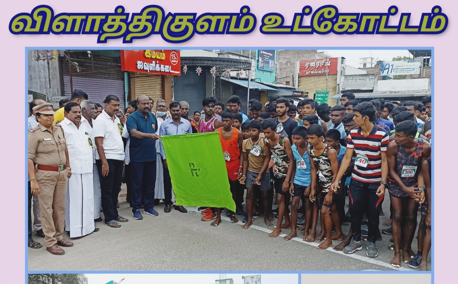 *இந்த மினி மாரத்தான் போட்டியில் 14கி.மீ ஆண்கள் பிரிவில் 209பேர்,10 கி.மீ பெண்கள் பிரிவில் 58 பேர், குழந்தைகளுக்கான 2 கி.மீ பிரிவில் 25பேர் கலந்துகொண்டனர். மேலும் விளாத்திகுளம் அனைத்து மகளிர் காவல் நிலைய காவல் ஆய்வாளர் திருமதி.விஜயலட்சுமி, விளாத்திகுளம் காவல் உதவி ஆய்வாளர் திரு.காசிலிங்கம், திரு.தேவராஜ் மற்றும் காவலர்கள் ஆகியோர்கள் மூலம் போக்குவரத்தினை ஒழுங்குப்படுத்துதல், பாதுகாப்பு ஏற்படுகள் செய்யப்பட்டிருந்தன.*
