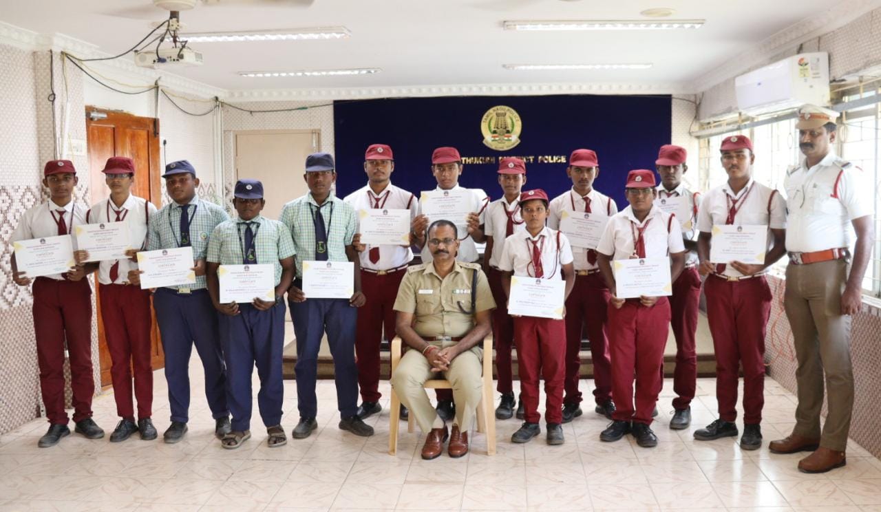 தூத்துக்குடியில் நடைபெற்ற நகர்புற உள்ளாட்சி தேர்தலின்போது ஆர்வத்துடனும், சேவை மனப்பான்மையுடனும் போக்குவரத்து சீர்செய்யும் பணியில் கலந்து கொண்டு சிறப்பாக பணியாற்றிய சாலை பாதுகாப்பு படை (Road Safety Patrol) மாணவர்கள் 16 பேருக்கு, அவர்களது சேவையை பாராட்டி மாவட்ட காவல் அலுவலகத்தில் இன்று மாவட்ட காவல் கண்காணிப்பாளர் திரு. எஸ். ஜெயக்குமார் அவர்கள் பாராட்டுச் சான்றிதழ் வழங்கினார்.*