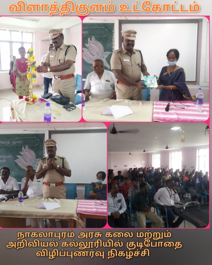 விளாத்திகுளம் உட்கோட்ட சங்கரலிங்கபுரம் காவல் எல்லைகுட்பட்ட நாகலாபுரம் அரசு கலை மற்றும் அறிவியல் கல்லூரியில் ஆல்கஹாலிக்ஸ் அனானிமஸ் விடிவெள்ளி குழு மூலம் ஏற்பாடு செய்யப்பட்ட விழிப்புணர்வு நிகழ்ச்சியில் விளாத்திகுளம் துணை காவல் கண்காணிப்பாளர் திரு.பிரகாஷ் அவர்கள் தலைமை வகித்தார்கள். இந்நிகழ்ச்சியில் கல்லூரி மாணவ, மாணவியர்களுக்கு இருசக்கர வாகனங்களில் செல்லும்பொழுது கட்டாயமாக தலைக்கவசம் அணிந்து செல்ல வேண்டுமென்றும், SOS செயலி விழிப்புணர்வு, சாலை போக்குவரத்து விழிப்புணர்வு, போக்சோ சட்ட விழிப்புணர்வு,குற்ற வழக்குகளில் ஈடுபட கூடாது என்றும்,குழந்தை திருமணம் பற்றி விழிப்புணர்வு மற்றும் ஒமிக்ரான் வைரஸ் தடுப்பு நடவடிக்கை அனைவரும் கண்டிப்பாக முகக் கவசம் அணிவது ஆகியவை பற்றி விழிப்புணர்வு ஏற்படுத்தினார்கள்.*