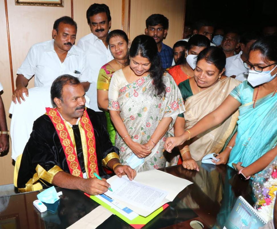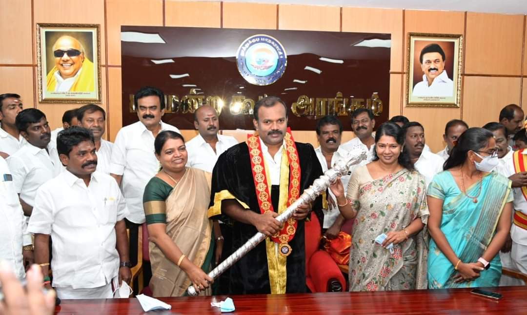 தூத்துக்குடி மாநகராட்சி மேயராக போட்டியின்றி தேர்வு செய்யப்பட்ட ஜெகன் பெரியசாமி இன்று மேயராக பொறுப்பேற்றுக் கொண்டார். அவருக்கு கனிமொழி எம்பி, அமைச்சர் கீதாஜீவன் ஆகியோர் வாழ்த்து தெரிவித்தனர்.
