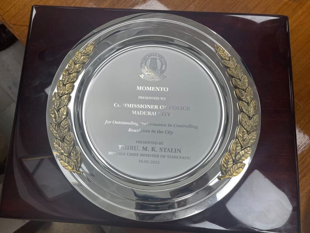 மதுரையில் குற்றச்செயல்களில் ஈடுபடுபவர்களுக்கு (Rowdyism) எதிரான சிறப்பு நடவடிக்கைக்காக மதுரை மாநகர காவல் ஆணையர் அவர்களுக்கு மாண்புமிகு முதலமைச்சர் மு.க ஸ்டாலின் அவர்கள், மாவட்ட ஆட்சித் தலைவர்கள், காவல்துறை, வனத்துறை அலுவலர்கள் மாநாட்டில் விருது வழங்கி சிறப்பித்தார்.