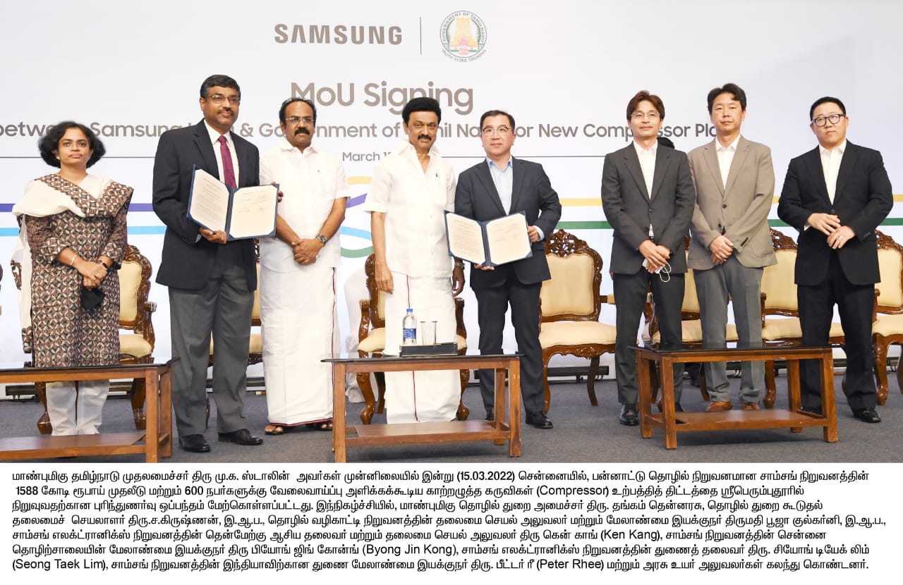 மாண்புமிகு தமிழ்நாடு முதலமைச்சர் மு க ஸ்டாலின் முன்னிலையில் நேற்று15.03.2022, சென்னையில் பன்னாட்டு தொழில் நிறுவனமான சாம்சங் நிறுவனத்தின் 1588 கோடி ரூபாய் முதலீடு மற்றும் 600 நபர்களுக்கு வேலைவாய்ப்பு அளிக்கக்கூடிய காற்றழுத்த கருவிகள் உற்பத்தி திட்டத்தை ஸ்ரீபெரும்புதூரில் நிறுவுவதற்கான புரிந்துணர்வு ஒப்பந்தம் மேற்கொள்ளப்பட்டது. இந்நிகழ்ச்சியில் மாண்புமிகு தொழில் துறை அமைச்சர் தங்கம்தென்னரசு, தொழில் துறை கூடுதல் தலைமைச் செயலாளர் ச.கிருஷ்ணன், தொழில் வழிகாட்டி நிறுவனத்தின் தலைமை செயல் அலுவலர் மற்றும் மேலாண்மை இயக்குனர் பூஜா குல்கர்னி, சாம்சங் எலக்ட்ரானிக்ஸ் நிறுவனத்தின் தென்மேற்கு ஆசிய தலைவர் மற்றும் தலைமை செயல் அலுவலர் கென் காங், சாம்சங் நிறுவனத்தின் சென்னை தொழிற்சாலையின் மேலாண்மை இயக்குனர் பியோங் ஜிங் கோன்ங்,சாம்சங் எலக்ட்ரானிக்ஸ் நிறுவனத்தின் துணைத்தலைவர் சியோங் டியேக் லிம், சம்சங் நிறுவனத்தின் இந்தியாவிற்கான துணை மேலாண்மை இயக்குனர் பீட்டர் ரீ மற்றும் அரசு உயர் அலுவலர்கள் கலந்து கொண்டனர்.