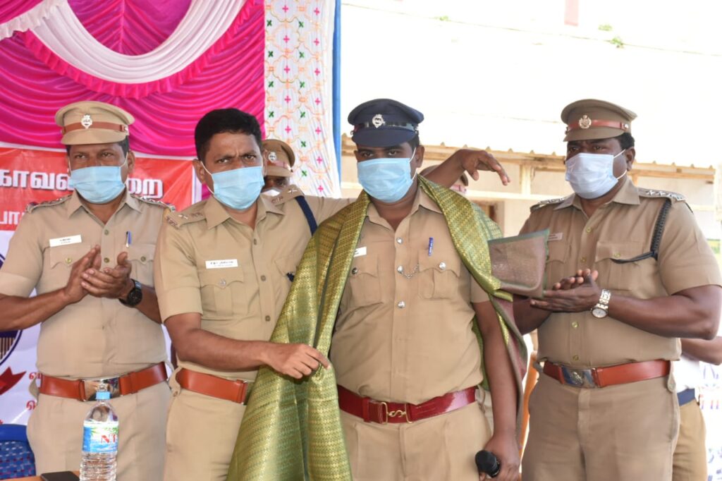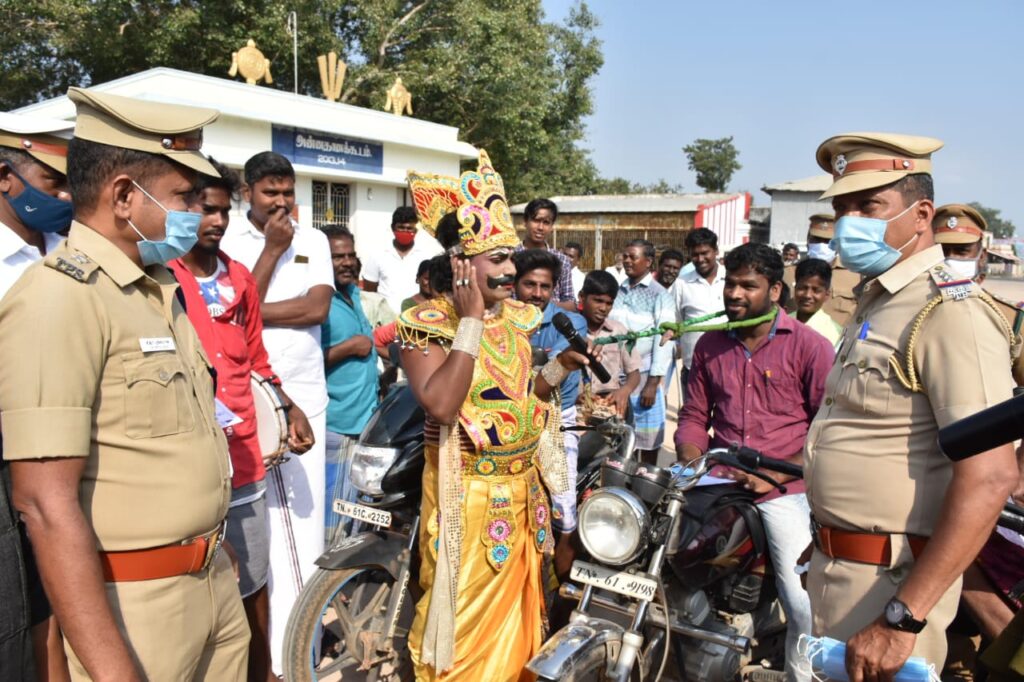 அதனைத் தொடர்ந்து 32வது தேசிய சாலை பாதுகாப்பு மாதத்தை முன்னிட்டு ஜறவரி 18முதல் பிப்ரவரி 17ம்தேதி வரை நாட்டுப்புறக் கலைஞர்கள் நாட்டுப்புற பாடல்கள் மூலமும், எமன் வேடமணிந்தும் மக்களுக்கு சாலை பாதுகாப்பு விதிகள் மற்றும் தலைக்கவசம் அணிவதன் அவசியம் குறித்து விழிப்புணர்வு மேற்கொண்டார்கள்.மேலும் மாவட்ட காவல் கண்காணிப்பாளர் அவர்கள் இரு சக்கர வாகன ஓட்டிகளுக்கு சாலை பாதுகாப்பு குறித்த துண்டுப்பிரசுரங்களை அளித்தும்,முகக் கவசம் அணியாதவர்களுக்கு கொரோனா குறித்த விழிப்புணர்வுகளை மேற்கொண்டும் முக கவசம் அளித்தும் விழிப்புணர்வு மேற்கொண்டார்.