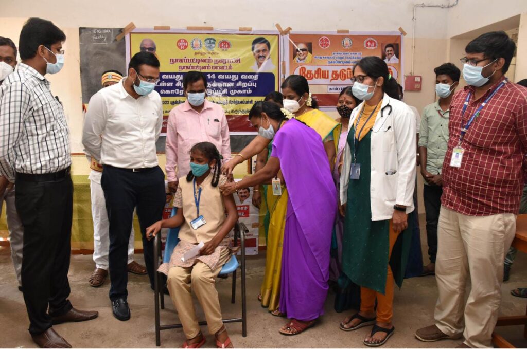 முன்னதாக சுதந்திர தின அமுத விழா மற்றும் சங்கமம் நடக்க இருக்கும் இடத்தை பார்வையிட்டு ஆய்வு மேற்கொண்டார். மேலும் நாகப்பட்டினம் நடராஜன் தமயந்தி மேல்நிலைப் பள்ளியில் 12 வயது முதல் 14 வயது வரையிலான சிறார்களுக்கு கொரோனா தடுப்பூசி செலுத்தும் முகாமினையும் மாவட்ட ஆட்சியா் டாக்டர் அருண் தம்புராஜ் பார்வையிட்டு ஆய்வு மேற்கொண்டார்.