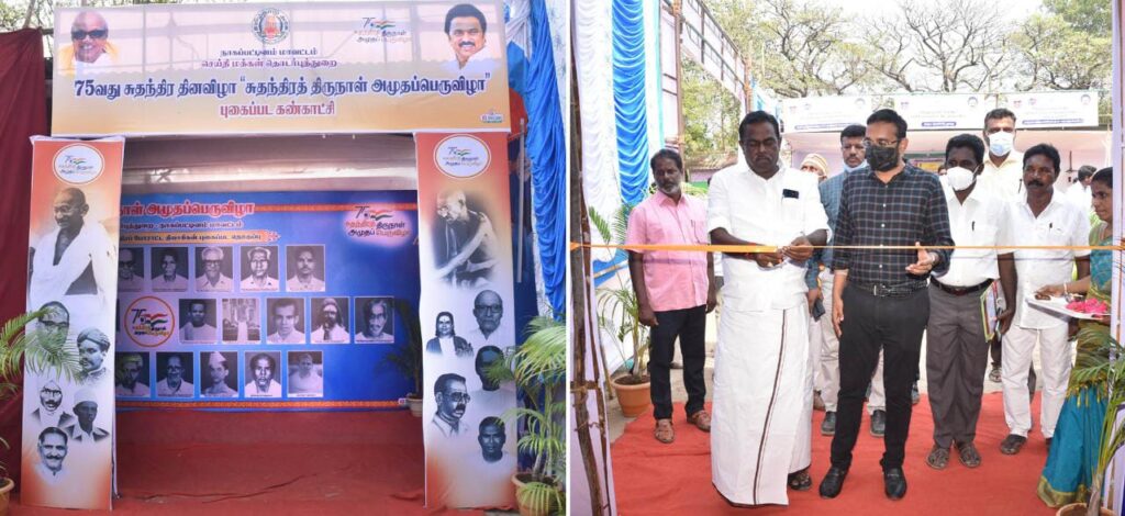 நாகப்பட்டினம் மாவட்டத்தில் செய்திமக்கள் தொடர்புதுறையின் சார்பில் 75-வது சுதந்திர தினவிழா சுதந்திர திருநாள் அமுதப் பெருவிழா நடைபெறுவதை தொடர்ந்து புதிய பேருந்து நிலையம் அவுரிதிடலில்; அமைக்கப்பட்டுள்ள செய்தி மக்கள் தொடர்பு துறையின் சுதந்திர போராட்ட தியாகிகளின் புகைப்படக் கண்காட்சி மற்றும் பலதுறை சார்ந்த அரங்குகளை மாவட்ட ஆட்சியர் அருண்தம்புராஜ் துவங்கி வைத்தார். தமிழ்நாடு மீன்வளர்ச்சிக் கழக தலைவர் கௌதமன் உடன்கலந்துக் கொண்டார்.