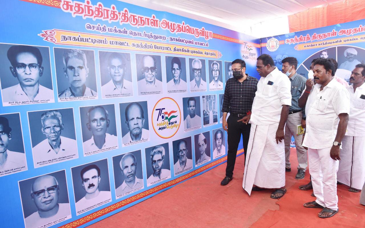 வீரதியாகிகளின் நினைவுகளை போற்றும் வகையில் அனைத்து மாவட்டங்களிலும் செய்தி துறையின் சார்பில் சுதந்திர திருநாள் அமுதப் பெருவிழா கொண்டாடப்பட்டு வருகிறது. அதனைத் தொடர்ந்து நாகப்பட்டினம் புதிய கடற்கரையில் நேற்று 75- வது சுதந்திர தினவிழா தொடங்கப்பட்டு அதனை தொடர்ந்து சுதந்திர போராட்ட தியாகிகளின் வீர பெருமிதங்களை நினைவு கூர்ந்து போற்றும் வகையில் இன்று மாவட்ட செய்தி மக்கள் தொடர்புதுறையின் சார்பில் சுதந்திர போராட்ட தியாகிகளின் புகைப்படக் கண்காட்சி அமைக்கப்பட்டது.