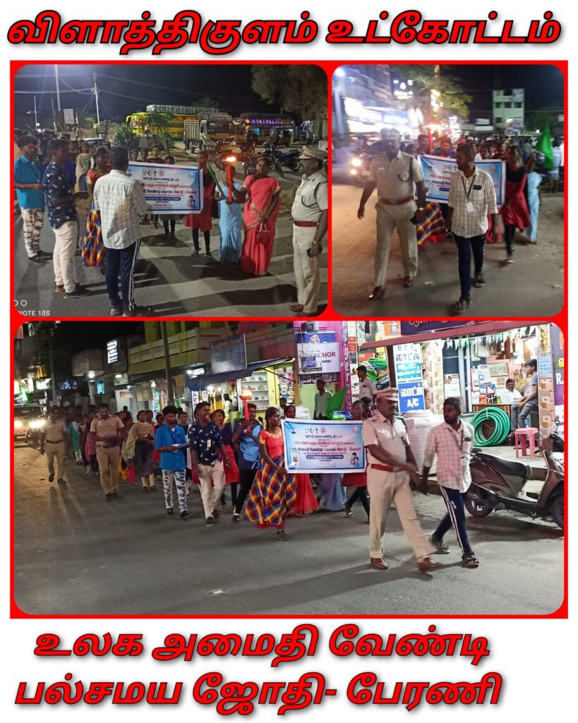 நாகலாபுரம் அரசு கலை மற்றும் அறிவியல் கல்லூரி நாட்டு நலப்பணித் திட்ட மாணவர்கள் உலக அமைதி வேண்டி பல்சமய ஜோதி- பேரணி விளாத்திகுளம் தாலுகா அலுவலகம் முன்பு விளாத்திகுளம் துணை காவல் கண்காணிப்பாளர் திரு.பிரகாஷ் அவர்கள் கொடியசைத்து ஆரம்பித்து வைத்து பேரணியிலும் கலந்து கொண்டார்கள். பேரணியில் மாணவர்கள் உலக அமைதி வேண்டியும், பொதுமக்கள் ஒற்றுமைக்காகவும் கோஷங்களை எழுப்பினார்கள். இந்தப் பேரணியானது விளாத்திகுளம் பேருந்து நிலையம் வழியாக வந்து சுமார் 2 கிலோமீட்டர் தூரம் நடைபெற்று ஆனந்த விநாயகர் கோவிலில் நிறைவடைந்தது.