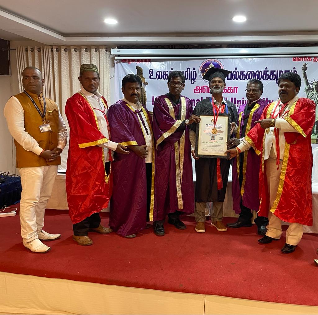உலகத் தமிழ் பல்கலைக்கழகம் வழங்கிய சேவைக்கான கௌரவ முனைவர் பட்டமளிப்பு நிகழ்ச்சியில் கௌதியா தொடக்கப்பள்ளி தலைமையாசிரியர் மு.முஹம்மது அலி அவர்களுக்கு கௌரவ முனைவர் பட்டம் கிடைத்துள்ளது .