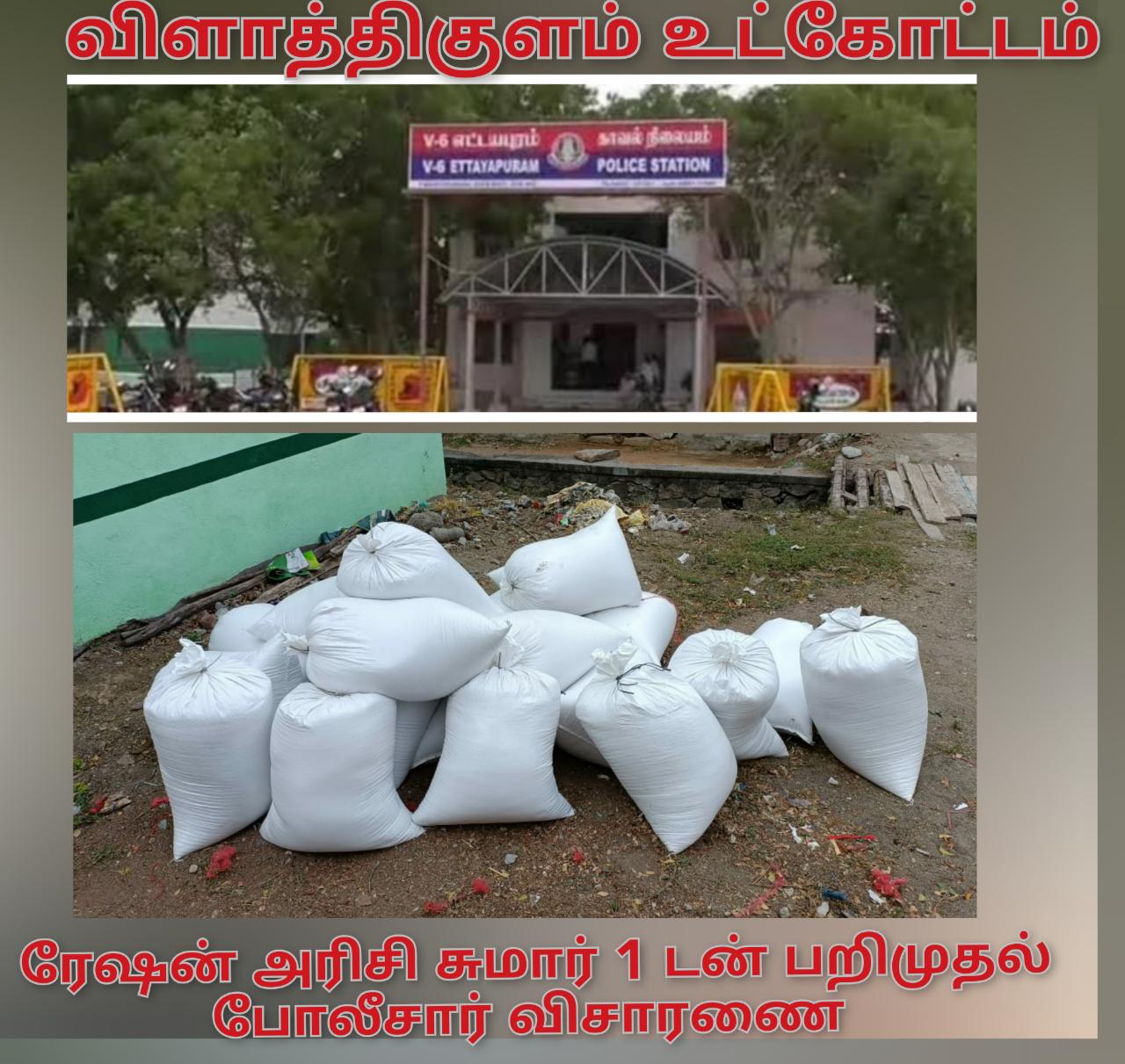 விளாத்திகுளம் உட்கோட்டத்தில் எட்டயபுரம் காவல் நிலைய எல்லைக்கு உட்பட்ட பகுதியில் சுமார் 1 டன் ரேஷன் அரிசி பறிமுதல் போலீஸ் விசாரணை .
