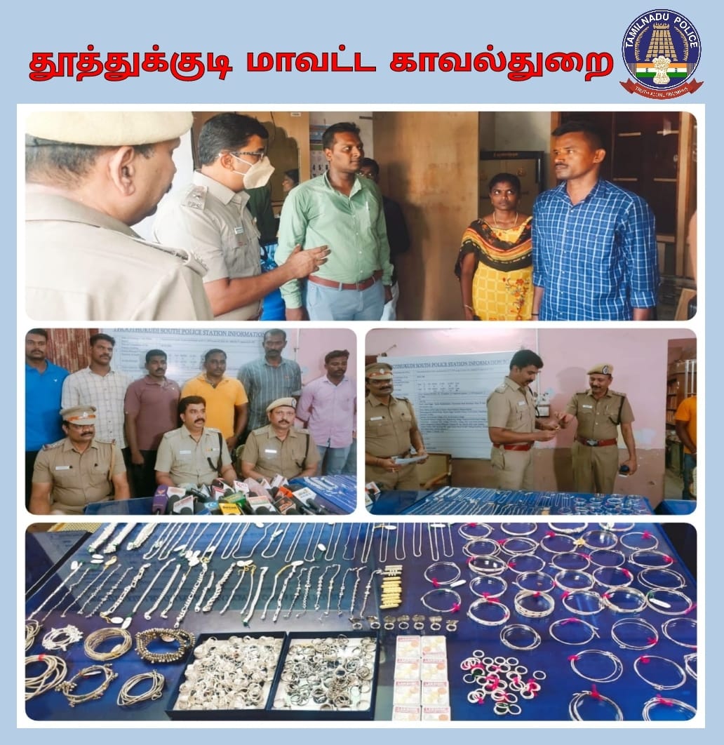 தூத்துக்குடி தென்பாகம் காவல் நிலைய எல்லைக்குட்பட்ட பகுதியில் நகை கடையின் சுவற்றில் ஓட்டைபோட்டு வெள்ளி பொருட்கள் திருட்டு – சம்பவ இடத்தை மாவட்ட காவல் கண்காணிப்பாளர் டாக்டர் திரு. எல். பாலாஜி சரவணன் அவர்கள் நேரில் சென்று பார்வையிட்டு விசாரணை – புகார் அளித்த 4 மணி நேரத்தில் இளஞ்சிறார் உட்பட 4 பேர் கைது – ரூபாய் 1, 88,500/- மதிப்புள்ள 3 கிலோ வெள்ளி பொருட்கள் மீட்பு – கைது செய்த தென்பாகம் காவல் நிலைய போலீசாருக்கு மாவட்ட காவல் கண்காணிப்பாளர் அவர்கள் பாராட்டு.