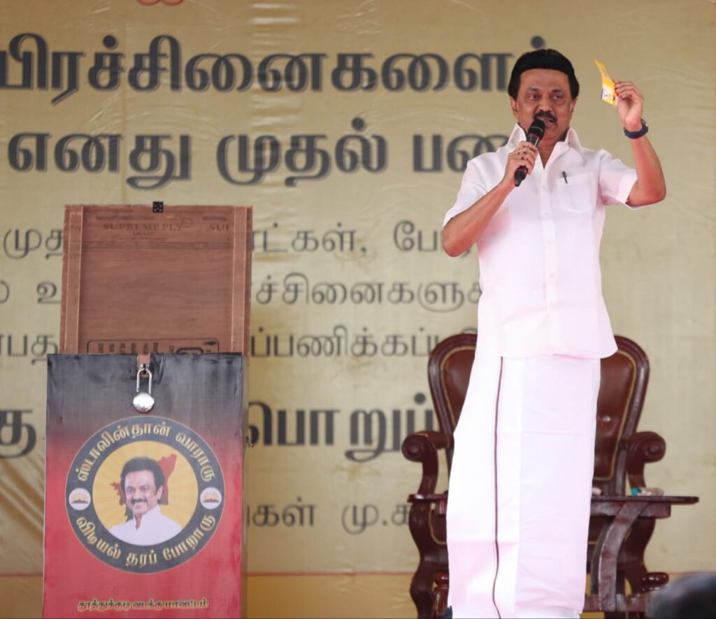 நாம் ஆட்சிக்கு வந்து பொறுப்பேற்ற நாளிலிருந்து 100 நாட்களில் இந்தப் பெட்டியில் இருக்கும் கோரிக்கைகள் அனைத்தையும் நிறைவேற்றியே தீர்வான் இந்த ஸ்டாலின் என்ற அந்த உறுதியோடு இந்த நிகழ்ச்சியை நடத்திக் கொண்டிருக்கிறோம்.