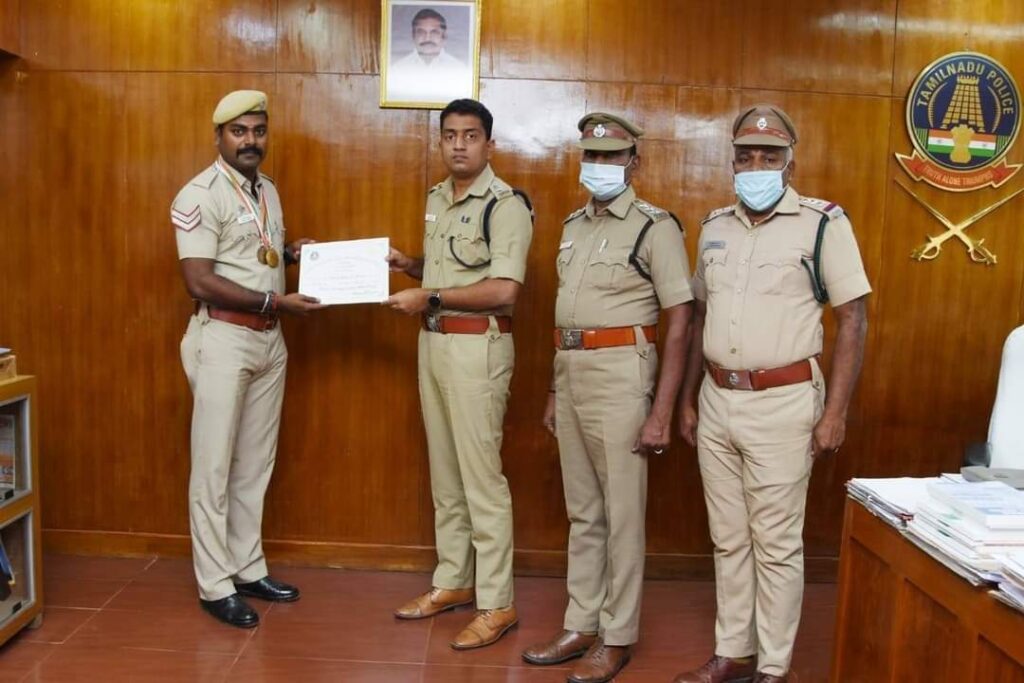 ஆயுதப்படை காவலர் வினோத்குமார் தனிநபர் கார்பன் துப்பாக்கி சுடுதலில் 2 தங்கப் பதக்கம், 1 வெள்ளி பதக்கம், 1 வெண்கலப் பதக்கம் பெற்றார்.ரெட்டிச்சாவடி காவல் நிலையம் காவலர் ராஜகோபால் அவர்கள் தனிநபர் இன்சாஸ் துப்பாக்கி சுடும் பிரிவில் வெண்கல பதக்கம் பெற்றார். பதக்கம் பெற்றவர்களுக்கு மாவட்ட போலீஸ் சூப்பிரண்டு வாழ்த்து தெரிவித்தார்.