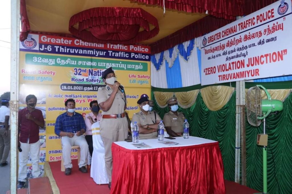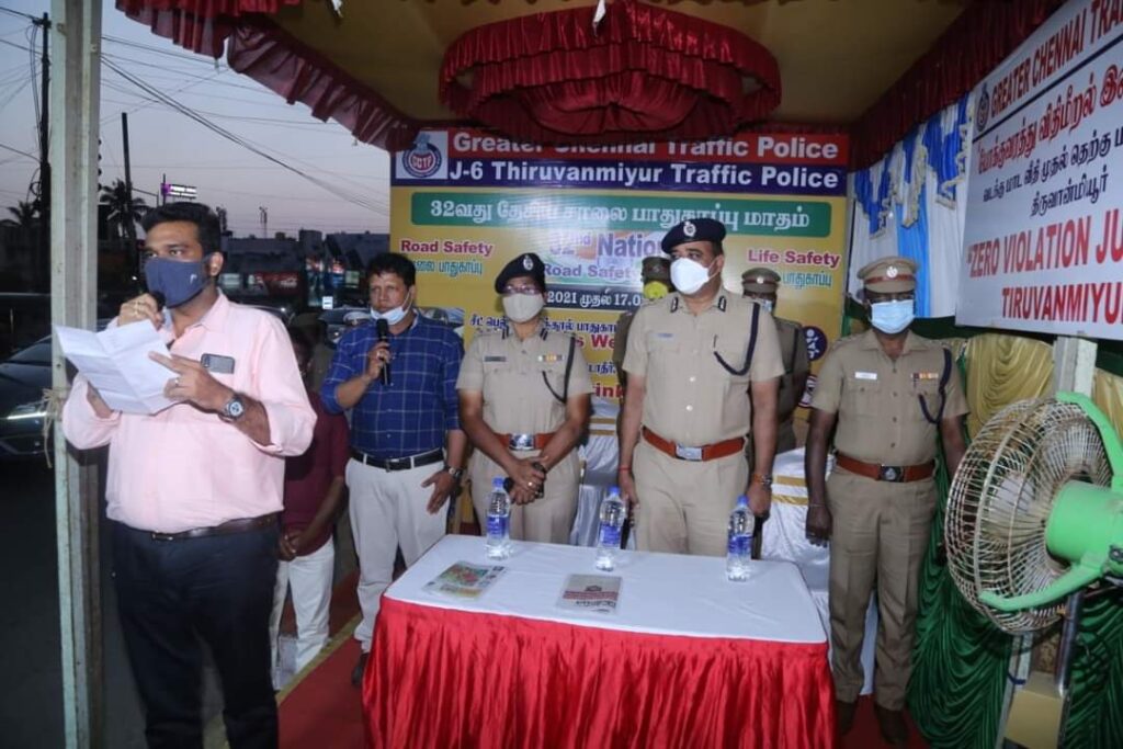 32-வது சாலை பாதுகாப்பு மாதத்தை முன்னிட்டு பல்வேறு நிகழ்ச்சிகள் மூலம் வாகன ஓட்டிகளுக்கு சென்னை போக்குவரத்து காவல்துறை விழிப்புணர்வை ஏற்படுத்தி வருகிறது. பிப்ரவரி 4 மற்றும் 5 ஆம் தேதிகளில் சென்னை மாதவரம் ரவுண்டானா, திருவொற்றியூர், அண்ணா ஆர்ச், கொரட்டூர், ஸ்பென்சர் பிளாசா சிக்னல், பச்சையப்பாஸ் சிக்னல், சைதாப்பேட்டை உள்ளிட்ட இடங்களில் மக்களுக்கு விழிப்புணர்வு அளிக்கப்பட்டது. இதன் இறுதி நிகழ்ச்சி, சென்னை திருவான்மியூர் சிக்னல் அருகில் நடைபெற்றது. இதில் ஆட்டோ, வேன் ஓட்டுநர்கள், விதிகளை மீறிய வாகன ஓட்டிகள் உள்ளிட்டோரை அமர வைத்து அவர்களுக்கு வித்தியாசமான முறையில் விழிப்புணர்வு அளிக்கப்பட்டது. இந்நிகழ்ச்சியில் திரைப்பட நடிகர்கள், அரசியல் பிரபலங்கள் உள்ளிட்டோரின் குரலில் பேசி போக்குவரத்து விதிகளை எவ்வாறு கடைபிடிப்பது என்பது குறித்து விஜே விஷ்வா எடுத்துரைத்தார். இதில் கலந்துகொண்ட போக்குவரத்து கூடுதல் கமிஷ்னர் கண்ணன் , வீட்டில் இருந்து புறப்படக்கூடிய ஆண்களுக்கு போக்குவரத்து விதிகளை மதித்து வாகனங்களை ஓட்ட வேண்டும் என பெண்கள் அறிவுறுத்த வேண்டும் என கேட்டுக்கொண்டார். வெள்ளம், நில அதிர்வு இது போன்ற இயற்கை பேரிடர்களின் விளைவுகளை கூட காலப்போக்கில் சீர் செய்யலாம். ஆனால் சாலை விபத்து என்பது ஒரு நொடியில் நிகழக்கூடியது, எனவே குடும்பத்தை நினைவில் வைத்து அனைவரும் பாதுகாப்பாக இருக்க வேண்டும் என அறிவுறுத்தினார். மேலும், ஆட்டோ ஓட்டுநர்கள் தங்களின் கடமையை உணர்ந்து பொதுமக்களை கவனமாக அழைத்து செல்ல வேண்டும் என்று கூறினார். இதனையடுத்து பேசிய போக்குவரத்து தெற்கு இணை ஆணையர் லஷ்மி ஒவ்வொரு ஊருக்கும் ஒவ்வொரு சிறப்பு உண்டு என்றும், அவ்வாறு விபத்து என்று சொன்னாலே சென்னை தான் அனைவருக்கும் நினைவுக்கு வரும் எனவும் குறிப்பிடார்.