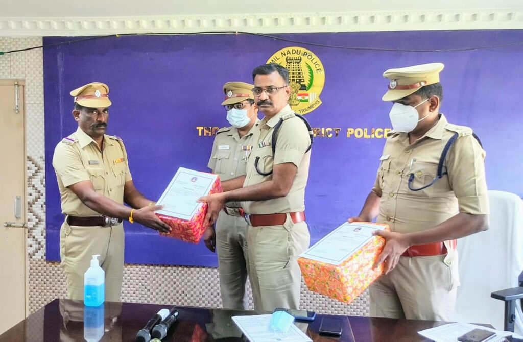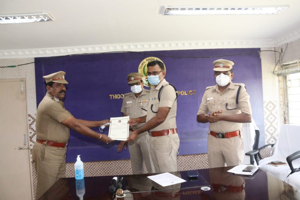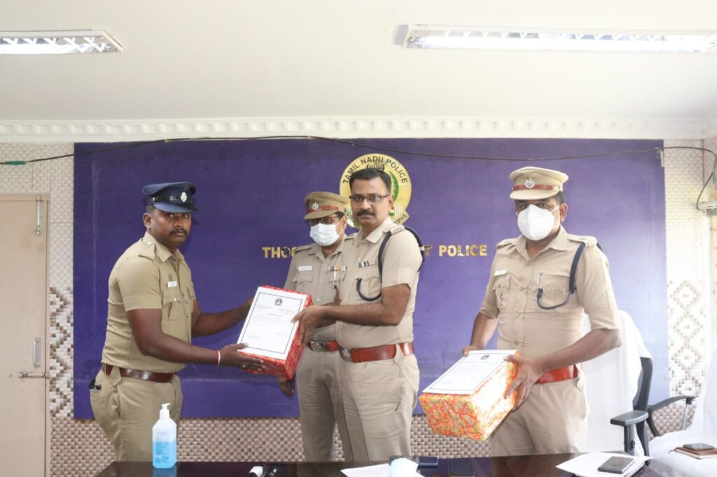 காவல் ஆய்வாளர்கள் உட்பட 20 காவல்துறையினரின் சிறந்த சேவையை பாராட்டி தூத்துக்குடி மாவட்ட போலீஸ் சூப்பிரண்டு எஸ்.ஜெயக்குமார் வெகுமதி மற்றும் பாராட்டுச் சான்றிதழ் வழங்கி பாராட்டினார்.