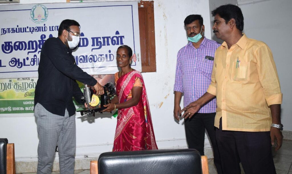 பின்னர் நாகப்பட்டினம் மாவட்டம், வேதாரண்யம் வட்டம, வெள்ளப்பள்ளம் ஊராட்சி வானவன்மகாதேவி கிராமத்தை சேர்ந்த சங்கீதா என்பவர்க்கு சுயதொழில் செய்வதற்காக மாவட்ட ஆட்சியர் தன் விருப்ப நிதியிலிருந்து தையல் இயந்திரத்தையும், உலக சுற்றுச்சுழல் தினத்தை முன்னிட்டு முதலமைச்சர் வழிகாட்டுதலின் பேரில் தமிழ்நாடு மாசுகட்டுப்பாட்டு வாரியம் மற்றும் மாவட்ட நிர்வாகம் இணைந்து சுற்றுச்சூழல் விழிப்புணர்வு மற்றும் சுற்றுச்சூழல் பாதுகாப்பு மேம்பாட்டு செயல் திறனுக்காக வனம் தன்னார்வத் தொண்டு அமைப்புக்கும் மற்றும் அருள்ஜோதி என்பவர்க்கும் பசுமை முதன்மையாளர் விருதும், தலா ரூ1 லட்சம் வீதம் இரண்டு லட்சத்திற்கான காசேலையை மாவட்ட ஆட்சியர் வழங்கினார்.