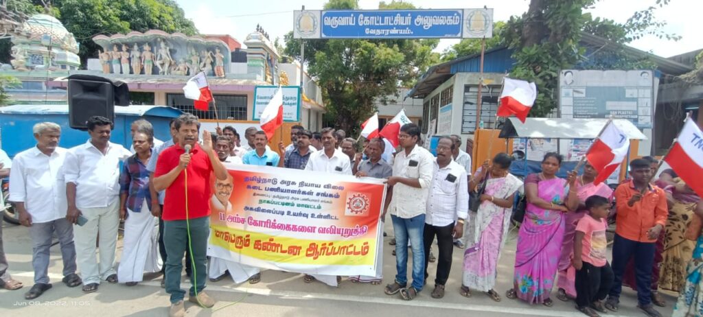 சரியான எடையில் தரமான பொருட்கள் பொட்டலமாக வழங்குதல் உள்ளிட்ட 11 அம்ச கோரிக்கைகளை நிறைவேற்ற வலியுறுத்தி 8.6 .2022 கோட்ட அளவில் வேலைநிறுத்தம் மற்றும் கண்டன ஆர்ப்பாட்டத்தை நடத்தினர்.