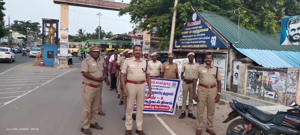 நாகப்பட்டினம் மாவட்டம் வேதாரண்யத்தில் கடலோர பாதுகாப்பு குழுமம் சார்பில் உலக ஆழ்கடல் தினத்தை முன்னிட்டு வேதாரணியம் பேருந்து நிலையத்திலிருந்து விழிப்புணர்வு பேரணி நடைபெற்றது.இந்தப் பேரணியை வேதாரணியம் உட்கோட்ட துணை காவல் கண்காணிப்பாளர்K. முருகவேல் மற்றும் வேதாரணியம் கடலோர பாதுகாப்பு குழுமம் துணை கண்காணிப்பாளர் D.சுரேஷ் ஆகியோர் துவக்கி வைத்தனர்.
