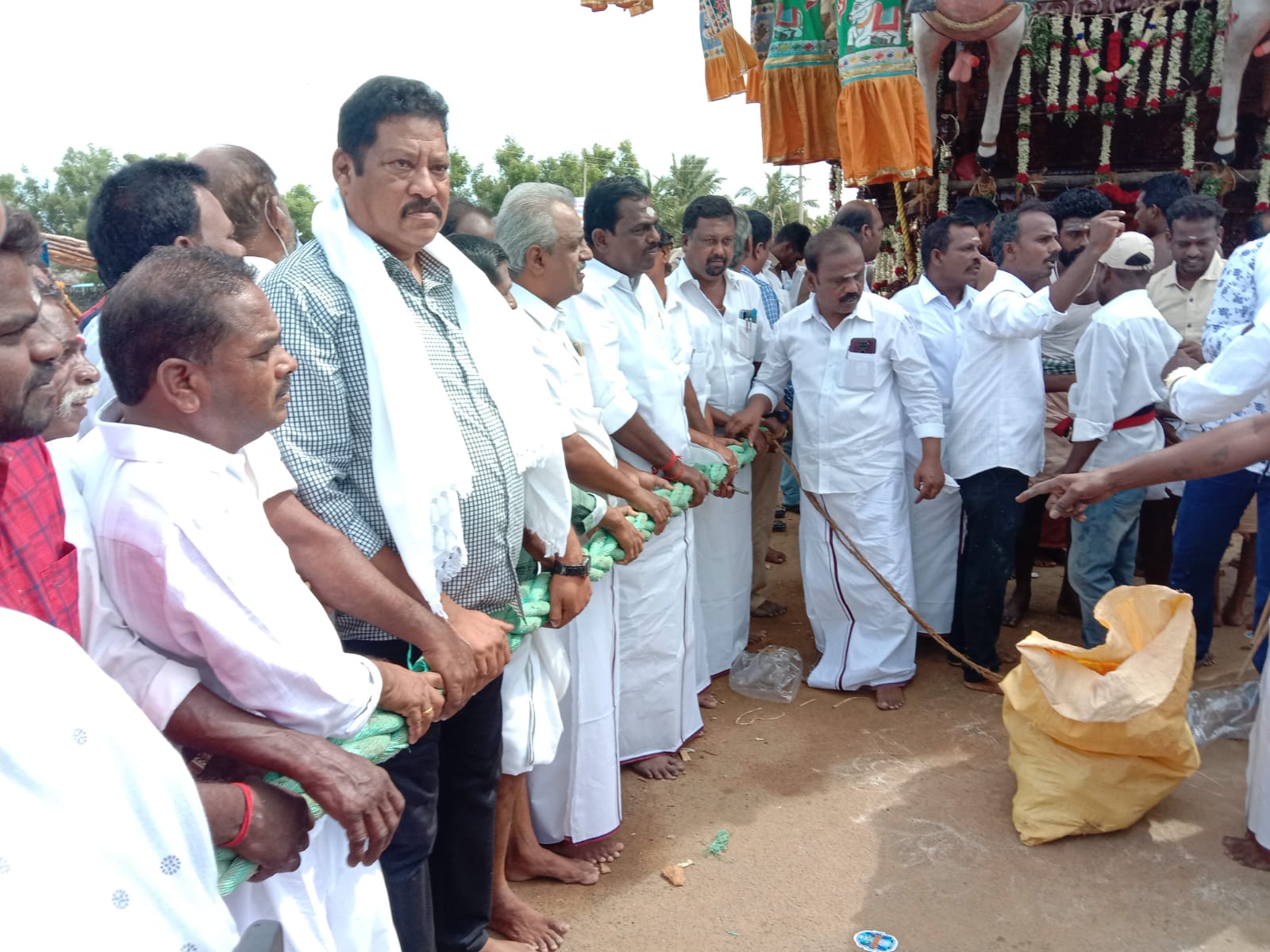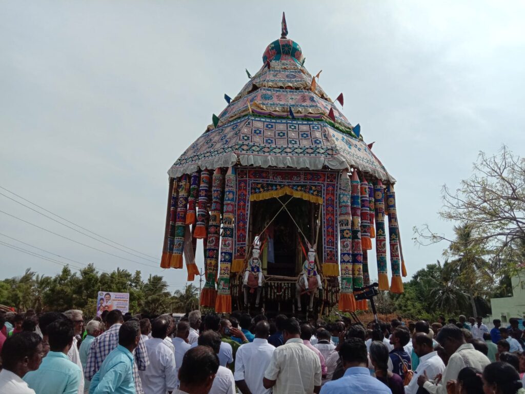 மற்றும் பலர் கலந்து கொண்டனர். கிராம மக்கள் மற்றும் ஏராளமான பக்தர்கள் தேரை வடம் பிடித்து இழுத்து முக்கிய வீதிகள் வழியாக வந்து தேரை நிலைக்கு கொண்டு வந்தனர்.