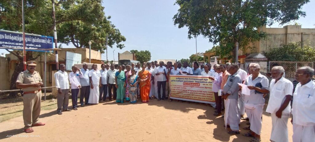 V. தியாகராஜன் பொருளாளர் ,T. வேலாயுதம் செய்தி தொடர்பாளர் மற்றும் ஏராளமான தமிழ்நாடு அரசுப் போக்குவரத்துக் கழக ஓய்வு பெற்றோர் நல சங்கத்தினர் கலந்து கொண்டனர்.இறுதியில் கண்டன முழக்கங்களை எழுப்பினர்.