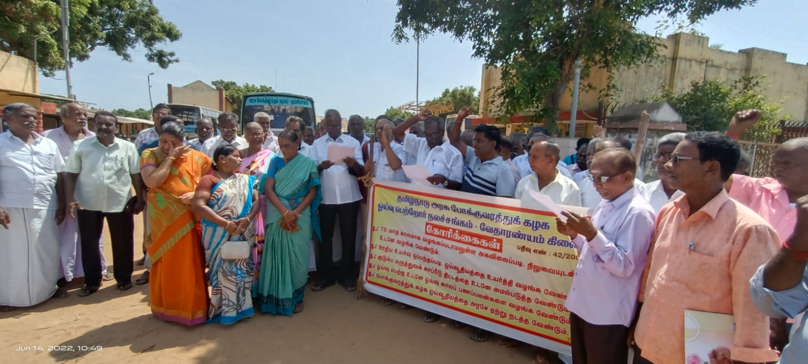வேதாரண்யத்தில் கோரிக்கைகளை நிறைவேற்ற கோரி தமிழ்நாடு அரசு போக்குவரத்து கழக ஓய்வு பெற்றோர் நலச் சங்கத்தினர் கோரிக்கை முழக்க ஆர்ப்பாட்டம்.