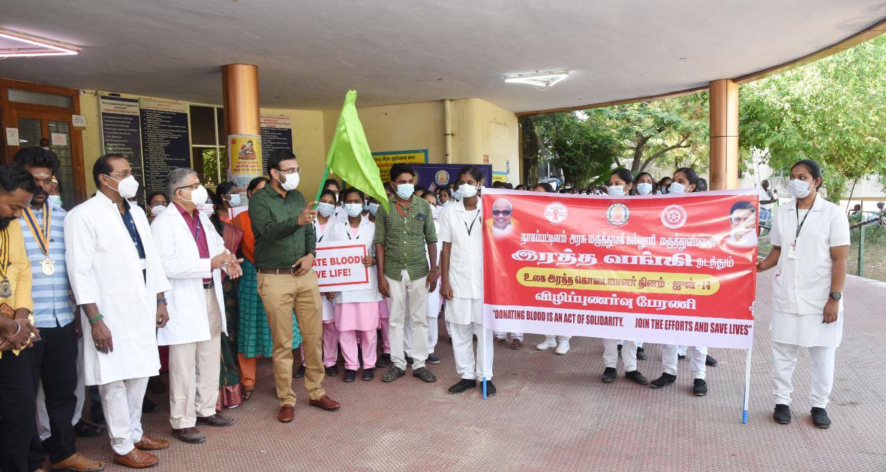 நாகப்பட்டினம் மாவட்டம் அரசு மருத்துவக் கல்லூரி மருத்துவமணையில் உலக குருதி கொடையாளர் தினம் கொண்டப்படுவதை முன்னிட்டு தன்னார்வ குருதி கொடையாளர் விழிப்புணர்வு பேரணியினை மாவட்ட ஆட்சியர் டாக்டர் அருண்தம்புராஜ் தலைமை வகித்து, கொடியசைத்து துவக்கி வைத்தார்.