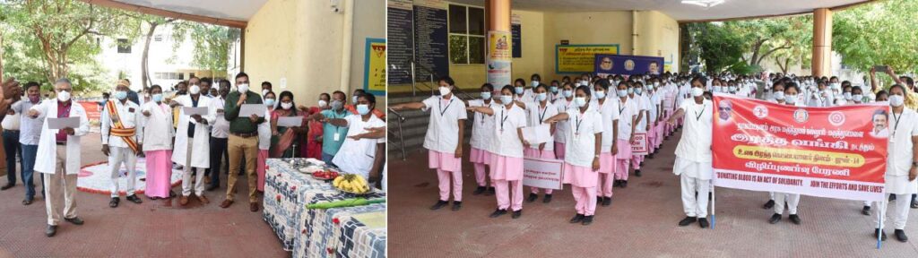 தமிழகம் ழுழுவதும் உலக குருதி கொடையாளர் தினம் கடைப்பிடிக்கபடுவதை முன்னிட்டு நாகப்பட்டினம் மாவட்ட அரசு மருத்துவக் கல்லூரி மருத்துவமனை இரத்த வங்கி மற்றும் ஹோலிடவுன் ரோட்டரி சங்கம் ஜே.சி.ஐ.சீ சிட்டி இணைந்து அரசு செவிலியர்கள் பேரணி மற்றும் இரத்த தானம் முகாம் நடந்தது.