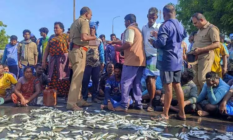 நாகூர் துறைமுகத்தில் மீன் விற்பனை செய்ய ஒரு தரப்பினர் எதிர்ப்பு தெரிவித்ததால் மற்றொரு தரப்பினர் சாலையில் மீன்களை கொட்டி இதன்காரணமாக அந்த பகுதியில் 3 மணி நேரம் போக்குவரத்து பாதிக்கப்பட்டது. மீன்பிடி தடைக்காலம் கடலில் மீன்வளத்தை பாதுகாக்கவும், கடலில் மீன் உற்பத்தியை பெருக்கவும் ஆண்டுதோறும் கிழக்கு கடல் பகுதியில் ஏப்ரல் மாதம் 15-ந் தேதி முதல் ஜூன் மாதம் 14-ந் தேதி வரை 61 நாட்கள் மீன்பிடி தடைக்காலத்தை மத்திய அரசு அமல்படுத்தியது.அப்போது நாகை, காரைக்கால் மாவட்டங்களில் ஆழ்கடலுக்கு சென்று மீன்பிடி தொழில் செய்யும் ஆயிரத்திற்கும் மேற்பட்ட விசைப்படகுகள், இழுவை படகு மீனவர்கள் கடலுக்கு மீன்பிடிக்க செல்லவில்லை. இரு தரப்பினர் இடையே பிரச்சினை இந்த நிலையில் மீன்பிடி தடைக்காலம் நீங்கியதால் நேற்று முன்தினம் மீனவர்கள் கடலுக்கு மீன்பிடிக்க சென்றனர். இதேபோல நாகை மாவட்ட மீனவர்களும் கடலுக்கு மீன்பிடிக்க சென்றனர்.இவ்வாறு பிடித்து வரப்பட்ட மீன்களை நாகை மாவட்டம் நாகூர் துறைமுகத்தில் வைத்து விற்பது ெதாடர்பாக மேலபட்டினச்சேரி, கீழப்பட்டினச்சேரி மீனவர்களுக்கு இடையே நேற்று பிரச்சினை ஏற்பட்டது.