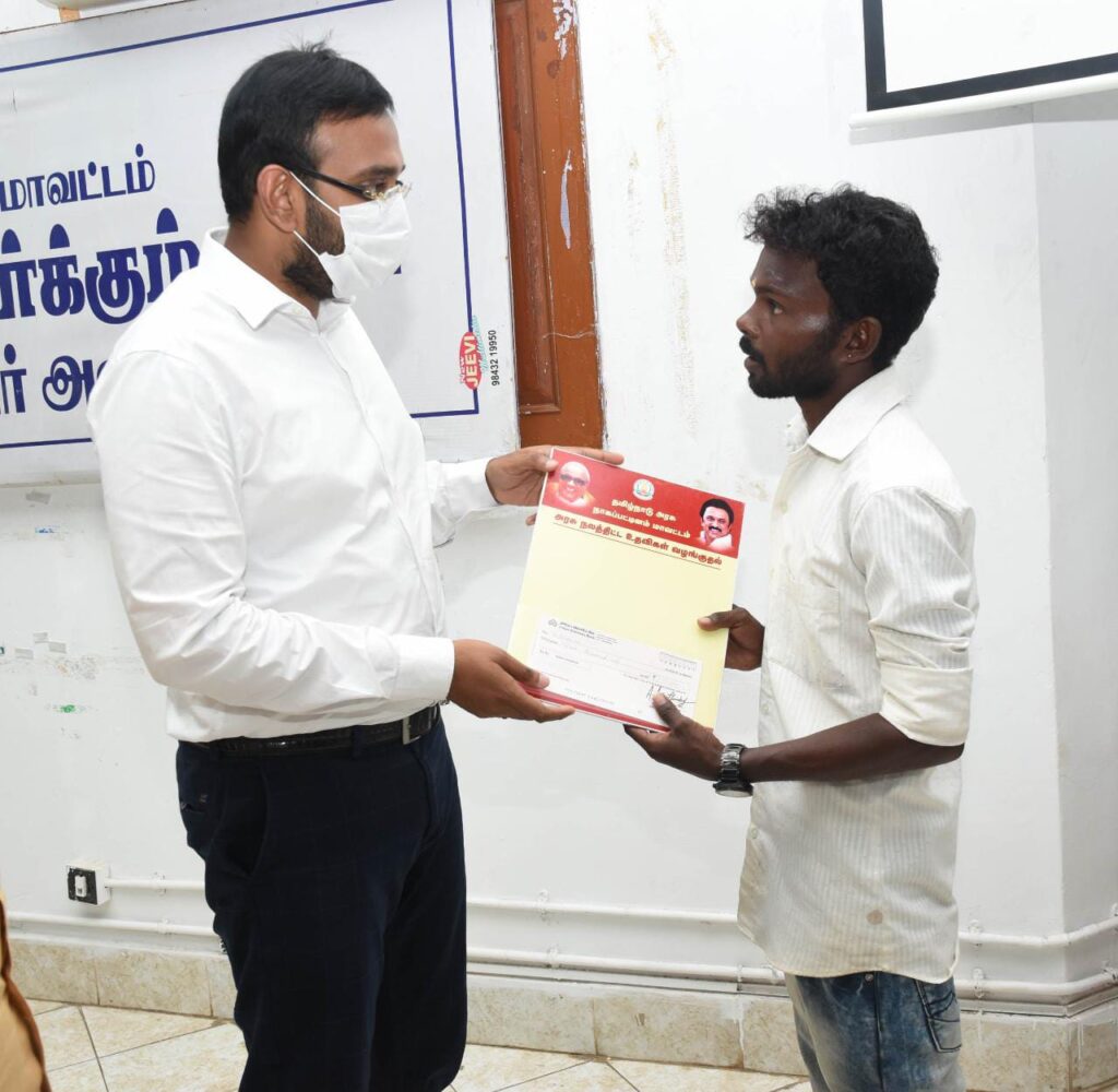 வாராந்திர மக்கள் குறைதீர்க்கும் நாள் கூட்டத்தில் வங்கிக் கடன் மற்றும் உதவித்தொகை, குடும்பஅட்டை, வேலைவாய்ப்பு, கல்வி உதவித் தொகை உள்ளிட்ட பல்வேறு கோரிக்கைகளை முன்வைத்து மொத்தம் 160மனுக்கள் பெறப்பட்டுள்ளது. பெறப்பட்ட மனுக்கள் மீது விரைந்து நடவடிக்கை மேற்கொள்ள சம்பந்தப்பட்ட அலுவலர்களுக்கு மாவட்ட ஆட்சித்தலைவர் அவர்கள் அறிவுறுத்தினார். அதனைத்தொடர்ந்து மாவட்ட செய்தியாளர் பி. மூர்த்தி புற்றுநோய் சிகிச்சைக்கான நிதியுதவியாக ரூ.30,000-க்கான காசோலையினையும், அன்னைசத்தியா அரசு குழந்தைகள் காப்பகத்திற்கு கல்வி உதவித் தொகையாக ரூ.15,000-க்கான காசோலையினையும், நம்பியார் நகரைச் சேர்ந்த ஆர்.சங்கர் இடது கண்ணில் ஏற்பட்ட விபத்து சிகிச்கைக்காக ரூ.15,000-க்கான காசோலையினையும் மாவட்ட ஆட்சித்தலைவர் அவர்களின் தன் விருப்ப நிதியிலிருந்து வழங்கினார். மேலும், திருநங்கைளுக்கான மூன்று நபர்களுக்கு அடையாள அட்டையினையும், 2 நபர்களுக்கு மாற்றுத்திறனாளிக்கான மாதாந்திர உதவித்தொகையினை மாவட்ட ஆட்சித்தலைவர் அ. அருண்தம்புராஜ் இன்று 27.06.2022 வழங்கினார்.