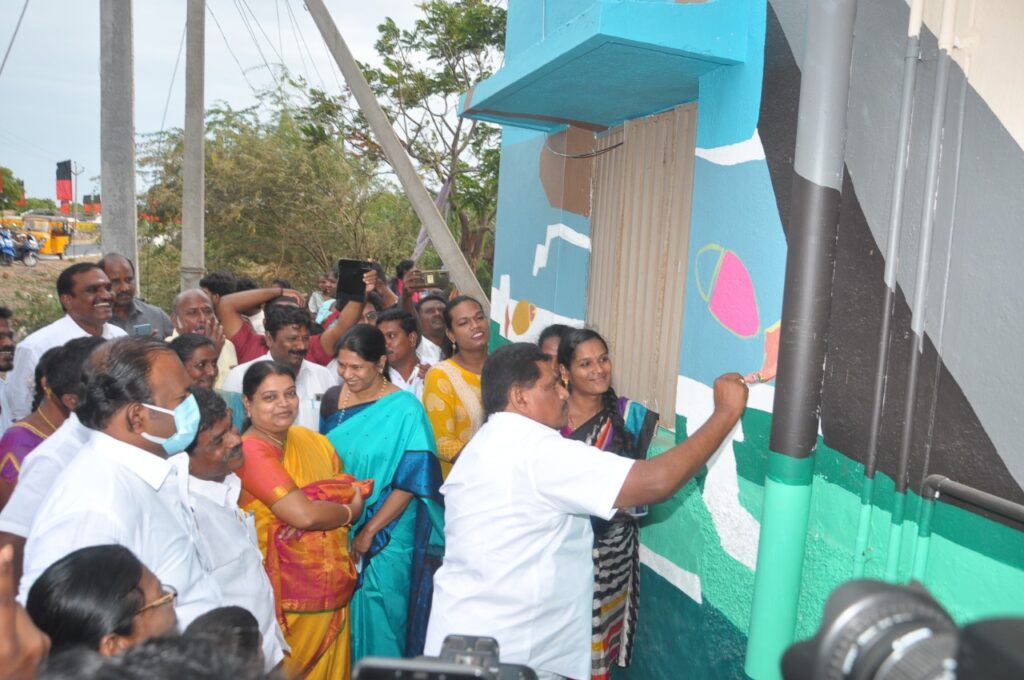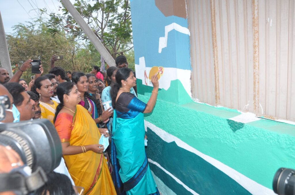 நெய்தல் விழாவை முன்னிட்டு மாப்பிள்ளையூரணி ஊராட்சிக்கு உட்பட்ட கோமஸ்புரத்தில் சுவர் ஓவியம் வரைந்து கனிமொழி எம்பி துவக்கி வைத்தார்.