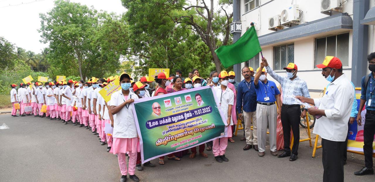 இந்திய அரசு மற்றும் தமிழக அரசின் உத்தரவிணற்க உலக மக்கள் தொகை தினம் -2022 அனுசரிக்கப்படுகிறது. ஒவ்வொரு ஆண்டும் சூலை 11ந் தேதி உலக மக்கள் தொகை தினமாக அனுசரிக்கப்பட்டு வருகிறது. இந்தியாவில் அறிவியலும், மருத்துவமும் வளர்ச்சி அடையாத காலத்தில் மக்கள் தொகை பெருக்கம் நிலையானதாக ஒரு கட்டுக்குள் இருந்ததது. பிறப்பு விகிதமும் இறப்பு விகிதமும் ஒரளவு சமமாக இருந்து வந்ததேயாகும். ஆனால், தற்போது மருத்துவ அறிவியலின் வளர்ச்சியால் இறப்பு பெருமளவில் குறைக்கப்பட்டு விட்டது. அதே சமயம் பிறப்பு விகிதம் குறையவில்லை. இந்தியாவில் மக்கள் தொகை 142 கோடியாக நெருங்கி விட்டது. தமிழ்நாட்டின் மக்கள் தொகை 8.4 கோடியை தாண்டிவிட்டது. மக்கள் தொகையில் முதல் இடத்தில் சீனா முதலிடத்தில் உள்ளது. இந்தியா 2- வது இடத்தில் உள்ளது. உலகிலேயே குடும்பநல திட்டத்தை ஒரு அரசின் திட்டமாக செயல்படுத்தியது இந்திய நாட்டில் தான், குடும்பநல திட்டத்தை வெற்றிகரமாக செயல்படுத்துவதில் தமிழகம் 2-வது இடத்தில் உள்ளது.
