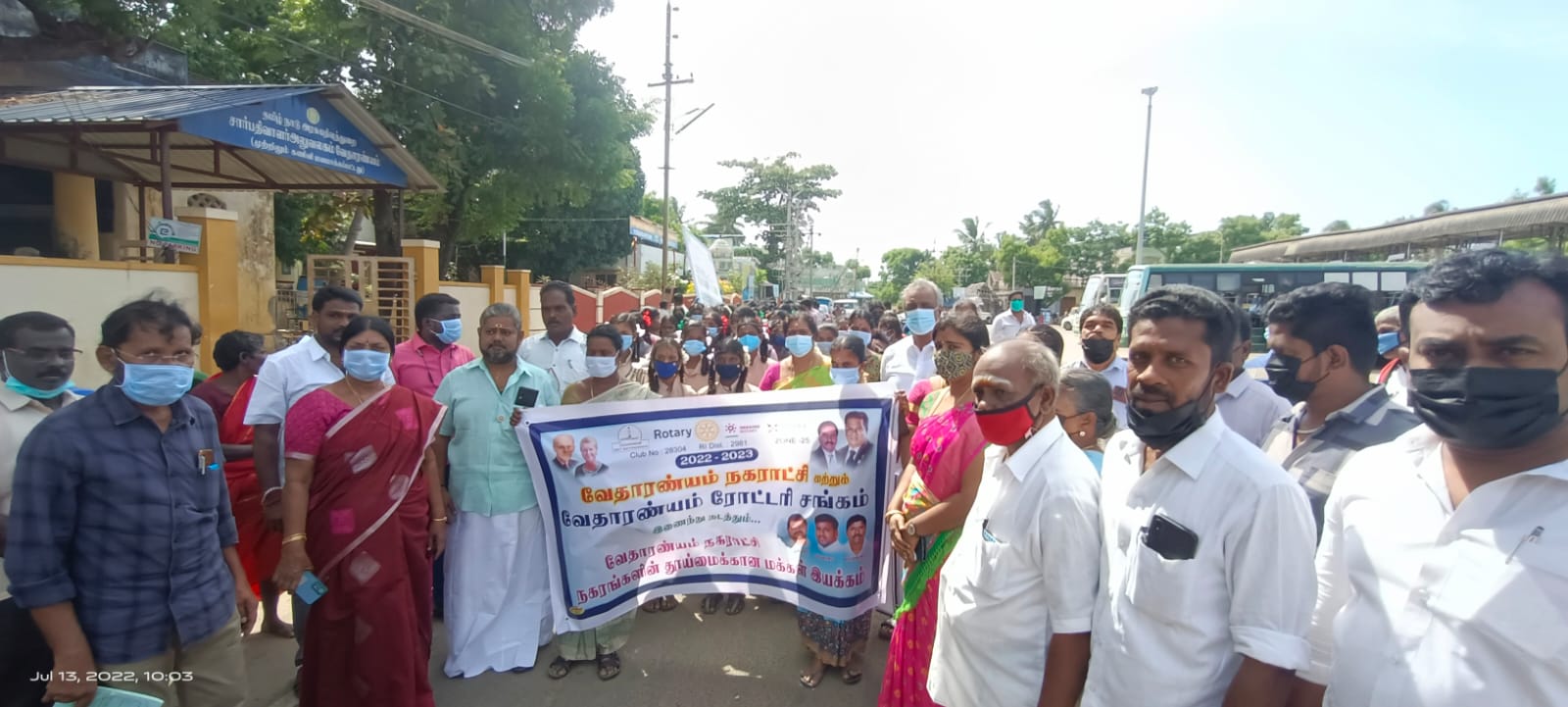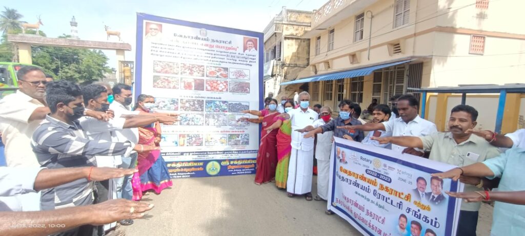 வேதாரண்யத்தில் வேதாரணியம் நகராட்சி மற்றும் வேதாரணியம் ரோட்டரி சங்கம் இணைந்து நடத்தும் நகரங்களின் தூய்மைக்கான மக்கள் இயக்க விழிப்புணர்வு பேரணி