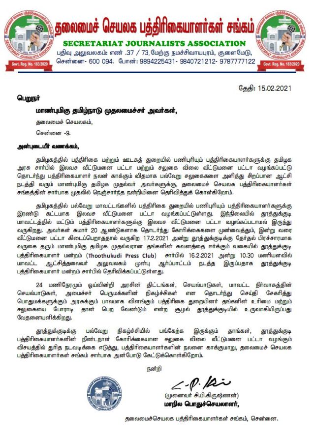 தூத்துக்குடிக்கு பல்வேறு நிகழ்ச்சியில் பங்கேற்க இருக்கும் தாங்கள், தூத்துக்குடி பத்திரிகையாளர்களின் நீண்டநாள் கோரிக்கையான சலுகை விலை வீட்டுமனை பட்டா வழங்கும் விசயத்தில் துரித நடவடிக்கை எடுத்து, பத்திரிகையாளர்களின் நலனை காக்குமாறு, தலைமைச் செயலக பத்திரிகையாளர்கள் சங்கம் சார்பாக அன்போடு கேட்டுக்கொள்கிறோம்.