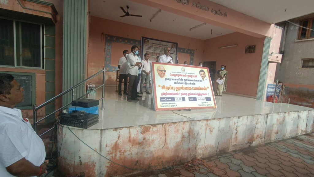 நாகப்பட்டினம் மாவட்டம் வேதாரண்யத்தில் வேதாரணியம் நகராட்சி சார்பில் நகரங்களின் தூய்மைக்கான மக்கள் இயக்கம் சிறப்பு தூய்மை பணி 23.07.2022 ல் வார்டு எண் 10 மற்றும் 16 இல் உள்ள