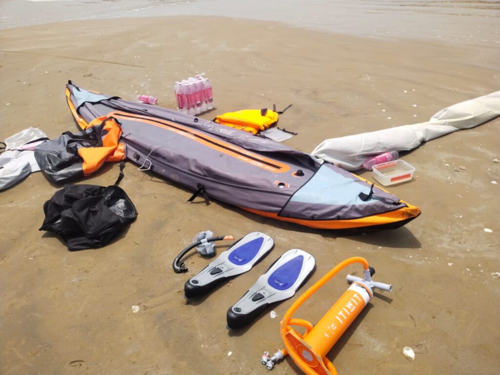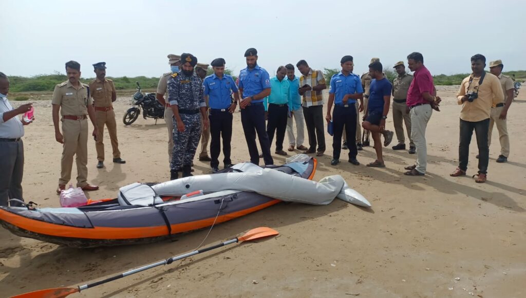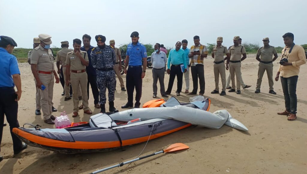 அந்தப் படகில் இரண்டு உயிர் கவச உடை , காற்றடிக்கும் பம்ப் ஒன்று, தண்ணீர் பாட்டில் 16 ஆகியவை இருந்தன. இதுபற்றி தகவலறிந்த காவல்துறையினர் மாவட்ட காவல் துணை கண்காணிப்பாளர் முருகவேல் தலைமையில் விரைந்து சென்று விசாரணை நடத்தி வருகின்றனர்.