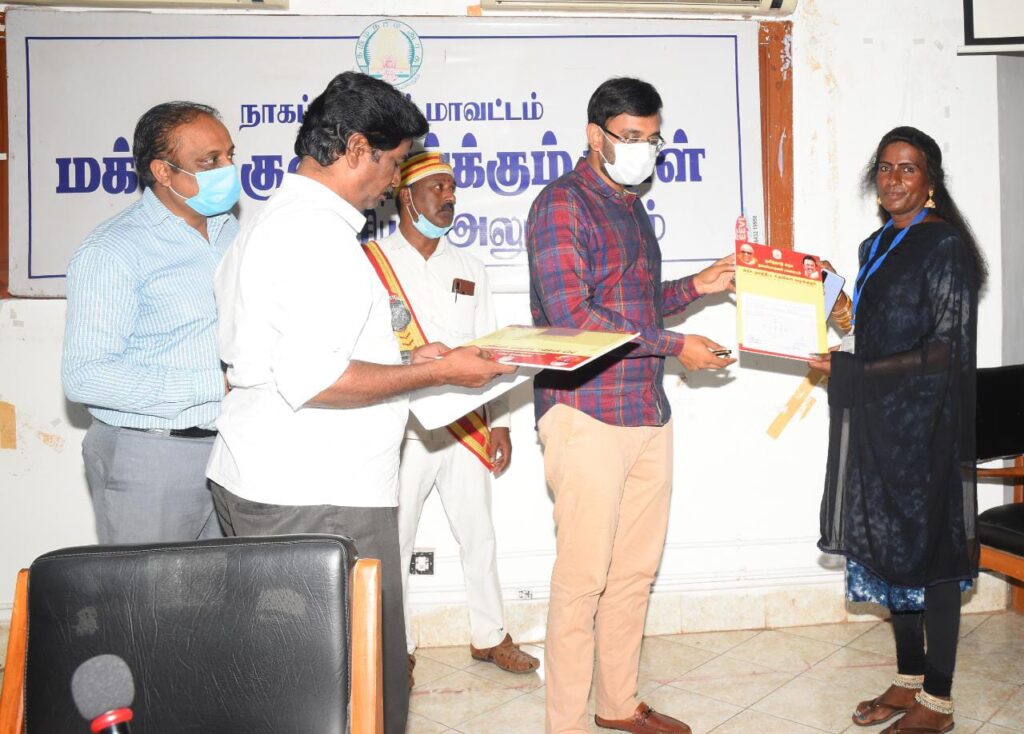 மேலும் கூட்டத்தில் நான்கு திருநங்கைகளுக்கு இலவச வீட்டு மனை பட்டாவினையும், ஓரு திருநங்கைக்கு குடும்ப அட்டையினையும், நாகப்பட்டினம் நகராட்சிக்கு உட்பட்ட பகுதியில் உள்ள இரண்டு மாற்று திறனாளிக்கு மாதந்திர உதவித் தொகையானரூ.1000க்கான ஆணையினையும் மாவட்ட ஆட்சியர் வழங்கினார்.