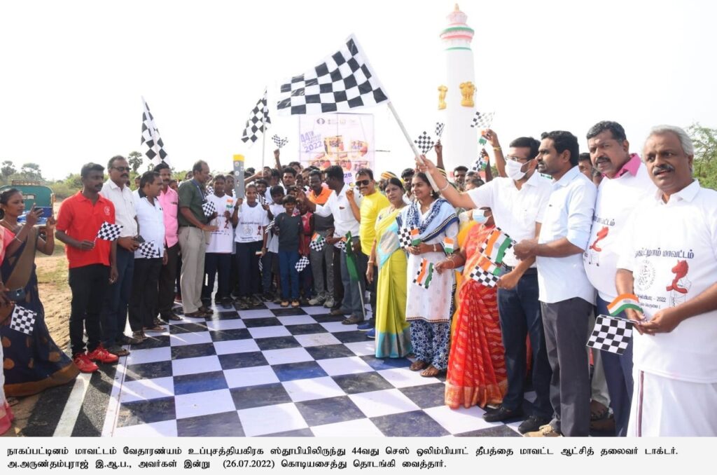 நாகை மாவட்டம் வேதாரண்யத்திலிருந்து நாகை வரை செல்லும் 44 செஸ் ஒலிம்பியாட் தீப தொடர் ஓட்டத்தை அகஸ்தியம்பள்ளி உப்புசத்தியாக கிரக நினைவு ஸ்தூபியிலிருந்து மாவட்ட ஆட்சியர் அருண் தம்புராஜ் தொடங்கி வைத்தார்.பள்ளி மாணவ மாணவிகள் கலந்து கொண்டு நாகை வரை செல்கின்றனர் .மேலும் இந்த நிகழ்ச்சியில் அரசு அதிகாரிகள் ஏராளமான பொதுமக்கள் கலந்து கொண்டனர் .இதில் பல்வேறு கலை நிகழ்ச்சிகள் நடத்தப்பட்டன.