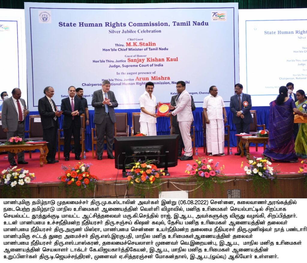மனித உரிமை பாதுகாப்பு தொடர்பாக மக்களிடம் விழிப்புணர்வு ஏற்படுத்தியது, மனித உரிமை மீறல் தொடர்பான புகார்களுக்கு விரைந்து நடவடிக்கை மேற்கொண்டது ஆகியவைகளுக்காக இந்த விருது வழங்கப்படுகிறது. அதன்படி, திருவாரூர், கன்னியாகுமரி, தூத்துக்குடி மாவட்ட ஆட்சியர்களுக்கும், மதுரை காவல் ஆணையர், கோவை, கிருஷ்ணகிரி மாவட்ட காவல் கண்காணிப்பாளர்களுக்கும் முதலமைச்சர் மு.க.ஸ்டாலின் விருதுகளை வழங்கினார். தமிழக முதல்வர் மூலம் விருது பெற்ற தூத்துக்குடி மாவட்ட ஆட்சியர் செந்தில் ராஜுக்கு பல்வேறு தரப்பினர் வாழ்த்துக்களை தெரிவித்தனர். செய்தி தொகுப்பு