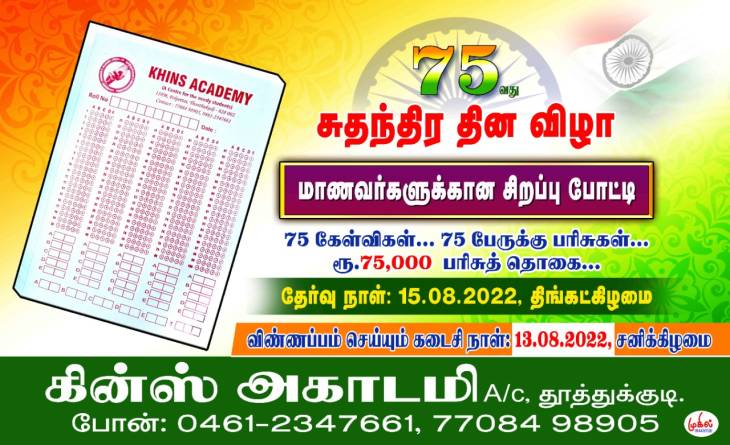 வரும் ஆகஸ்டு 15ம் தேதி இந்தியாவின் 75 வது சுதந்திரதினத்தை முன்னிட்டு தூத்துக்குடி போல்பேட்டையில் இயங்கி வரும் கின்ஸ் அகாடமி, மாணவர்களுக்கான போட்டி தேர்வு ரூ. 75 ஆயிரம் பரிசுத்தொகையோடு நடத்துகிறது என அறிவித்துள்ளனர்.