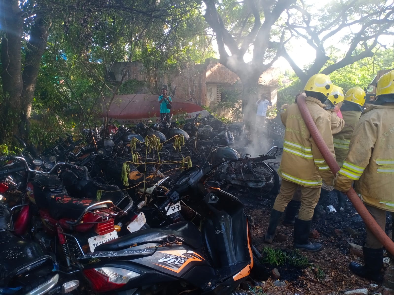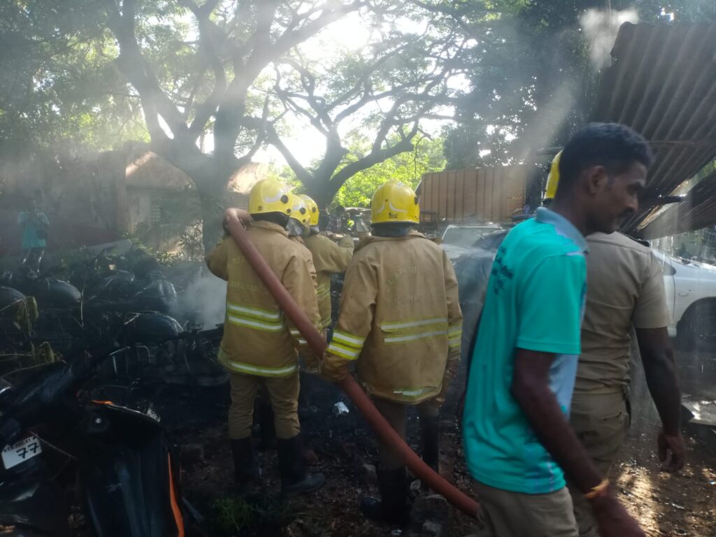 இதில் மைதானத்தில் நிறுத்திவைக்கப்பட்டிருந்த இருசக்கர வாகனங்கள் மற்றும் நான்கு சக்கர வாகனங்கள் எரிந்து