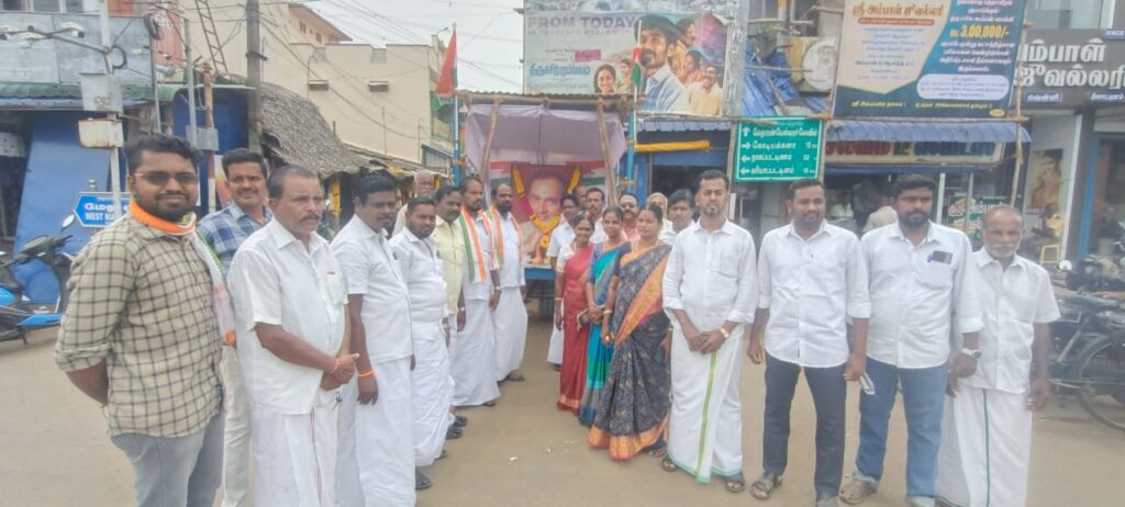 மேலவீதி ராஜாஜி பூங்கா எதிரில் முன்னாள் பாராளுமன்ற உறுப்பினர் பி. வி. ராஜேந்திரன் தலைமையில் அவர் திருவுருவ படத்திற்கு மாலை அணிவித்து