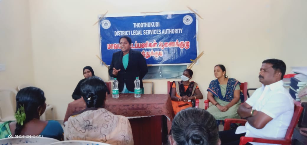 பெண்கள் மற்றும் குழந்தைகளின் பாதுகாப்பு பற்றிய சட்ட விழிப்புணர்வு முகாம் தேசிய சட்டப்பணிகள் ஆணைக்குழு மற்றும் தமிழ்நாடு மாநில சட்டப்பணிகள் ஆணைக்குழுவின் உத்தரவின் அடிப்படையில் தூத்துக்குடி மாவட்டம் மாப்பிள்ளையூரணி கிராமத்தில் உள்ள ஊராட்சி ஒன்றிய அலுவலகத்தில் வைத்து நேற்று (25.08.2022) தூத்துக்குடி மாவட்ட சட்டப்பணிகள் ஆணைக்குழுவின் மூலம் பெண்கள் மற்றும் குழந்தைகளின் பாதுகாப்பு பற்றிய சட்ட விழிப்புணர்வு முகாமானது நடைபெற்றது. அதில் மாண்புமிகு தூத்துக்குடி மாவட்ட சட்டப்பணிகள் ஆணைக்குழுவின் செயலாளர்/ சார்பு நீதிபதி திருமதி.M.பீரித்தா, M.L., அவர்கள் தலைமை தாங்கினார். நீதிபதி பீரித்தா