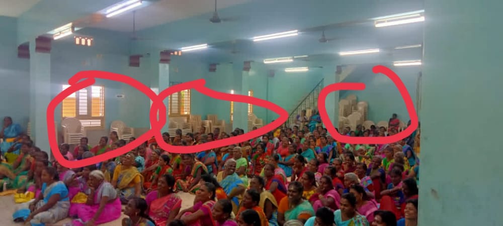 பெண்களை தரையில் அமர வைத்து விட்டு நிர்வாகிகள் மட்டும் சேரில் அமர்ந்து இருந்த சம்பவம் தொடர்பாக மாவட்ட நிர்வாகம், உரிய நடவடிக்கை எடுக்க வேண்டும் என சமூக ஆர்வலர்கள் பொதுமக்கள் கோரிக்கை விடுத்துள்ளனர்.