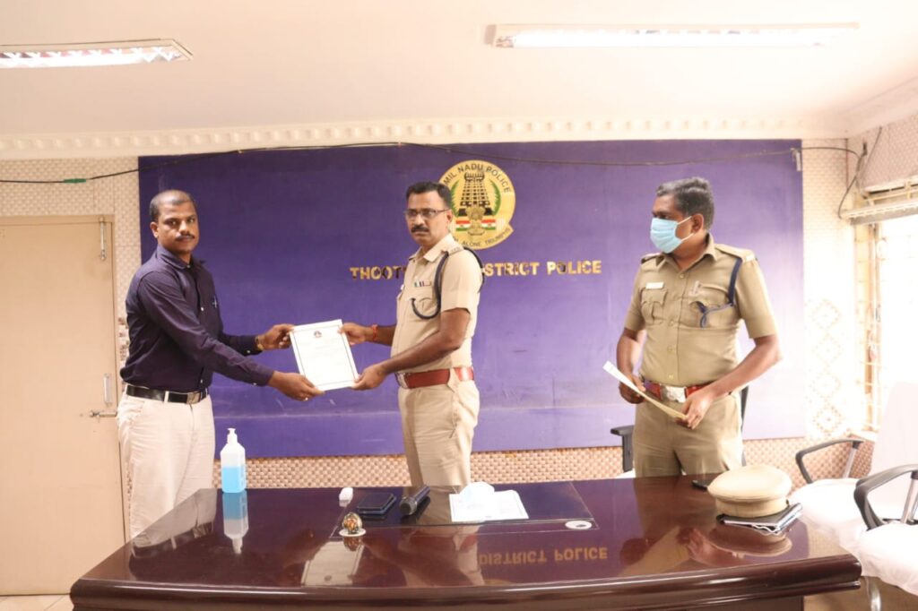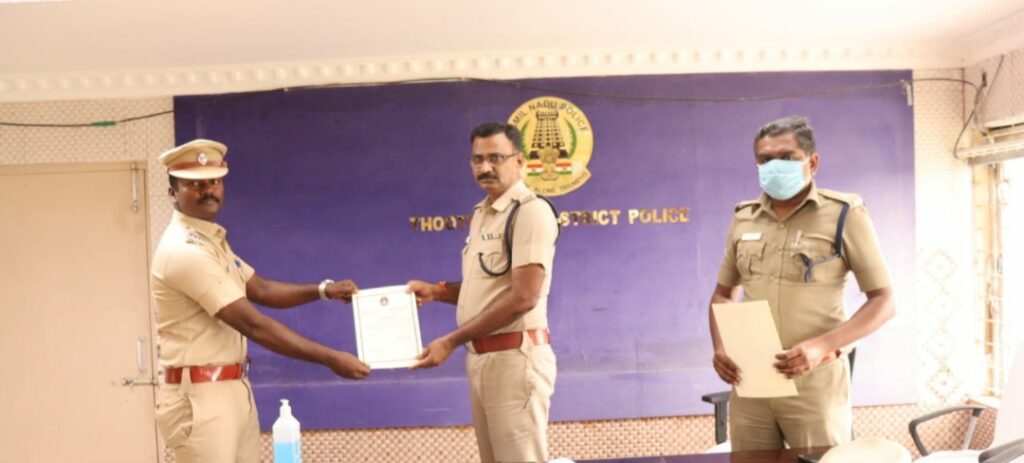 இப்பாராட்டு நிகழச்சியின்போது தூத்துக்குடி மாவட்ட குழந்தைகள் மற்றும் பெண்களுக்கு எதிரான குற்ற தடுப்பு பிரிவு கூடுதல் போலீஸ் சூப்பிரண்டு கோபி மற்றும் தனிப்பிரிவு ஆய்வாளர் பேச்சிமுத்து ஆகியோர் உடனிருந்தனர்.