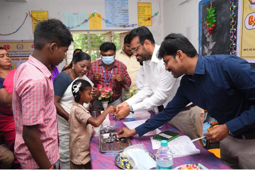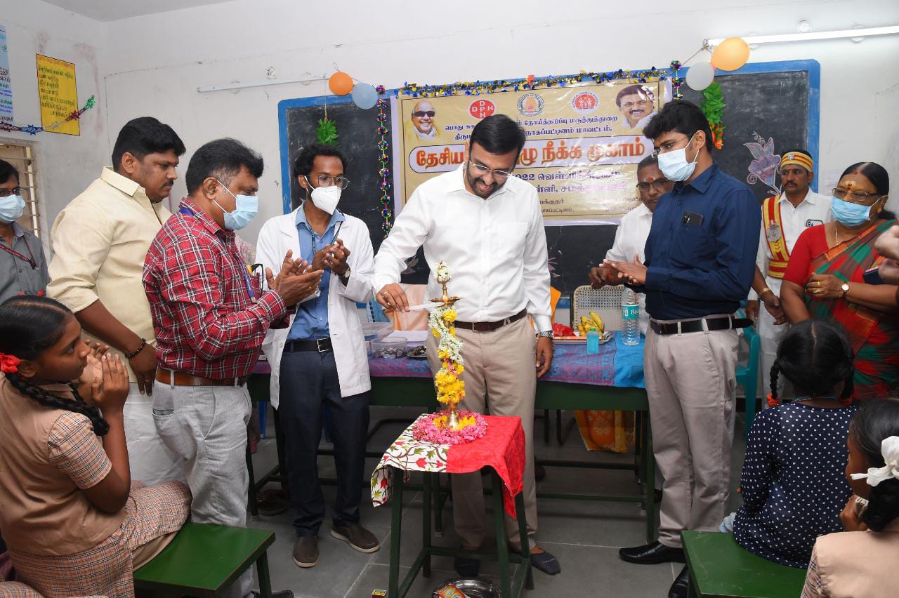 நாகப்பட்டினம் மாவட்டம் திருமருகல் ஊராட்சி ஒன்றியம் பனங்குடி ஊராட்சி சமத்துவபுரம் உயர் நிலைப்பள்ளியில் நடைபெற்ற தேசிய குடற்புழு நீக்கம் முகாமினை மாவட்ட ஆட்சித்தலைவர் அ.அருண்தம்புராஜ் குத்துவிளக்கேற்றி தொடங்கி வைத்து பள்ளி குழந்தைகளுக்கு குடற்புழு நீக்கம் (ஆல்பெண்டசோல்) மாத்திரைகளை வழங்கினார்.